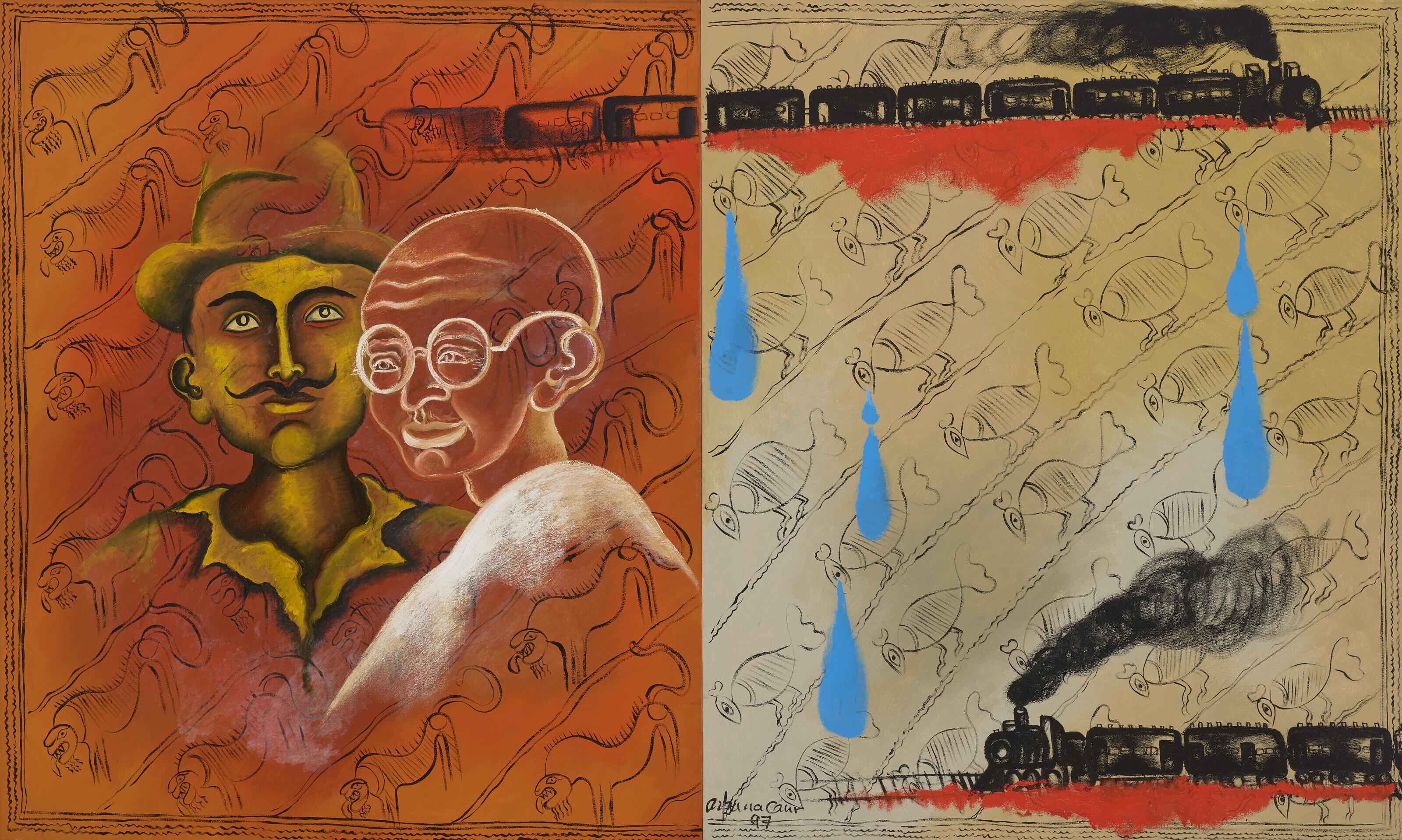 signed and dated 'Arpana Caur / 97' (lower center); further titled, inscribed, signed and dated ''The Great Divide' / Part 1 Diptych / (Left Side) / Arpana Caur / 1997' (on the reverse)