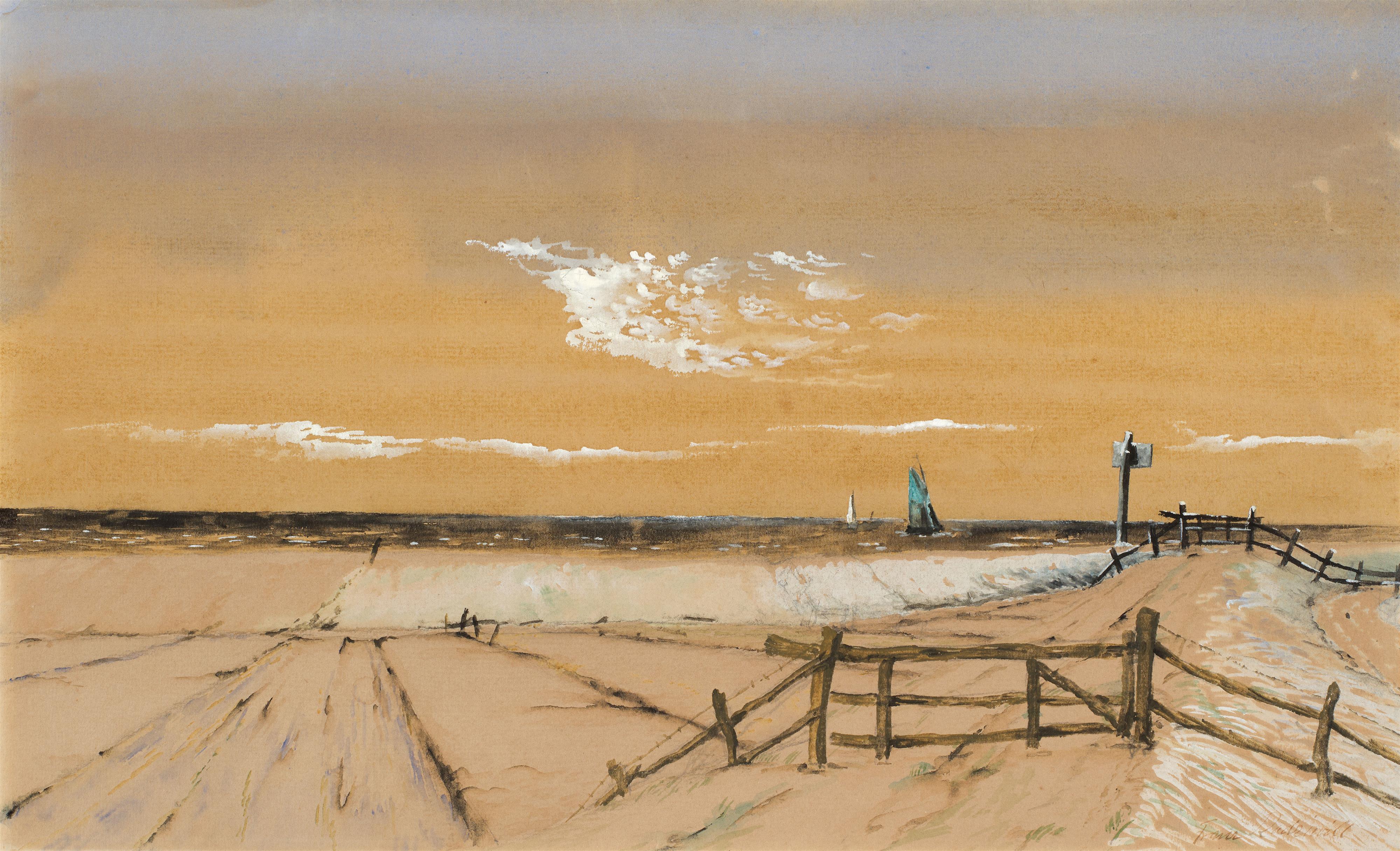 Aquarell und Tusche, weiß gehöht, auf bräunlichem Büttenpapier. 22,5 x 36,5 cm. Unter Glas gerahmt. Unten rechts mit Tinte signiert 'Franz Radziwill'. Rückseitig mit dem Stempel "Franz Radziwill Nordseebad Dangast b. Varel O.", handschriftlich mit Tinte nummeriert "219 Nr. 218". - Das Papier leicht gebräunt, mit einzelnen schwachen Griffspuren und unauffälligen Fleckchen.