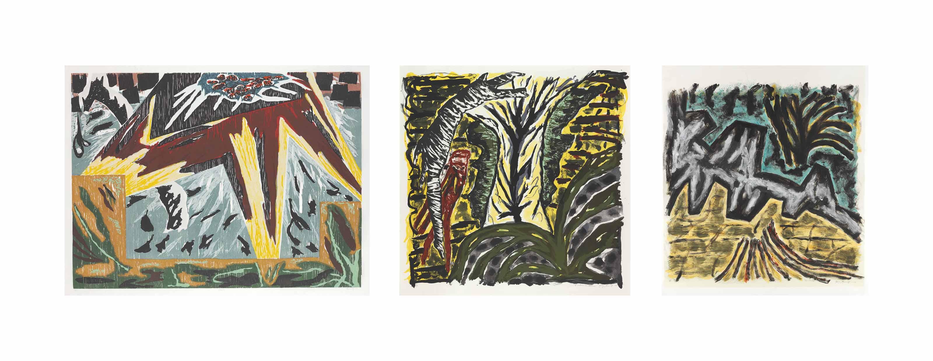 woodcut in colors, 1988, on Japon paper, signed, titled and dated in pencil, numbered 3/35, apparently in very good condition, not examined out of the frame; together with El Santurio de Chimayo, lithograph in colors, 1986; and Tierra Azul II, monotype in colors, 1986