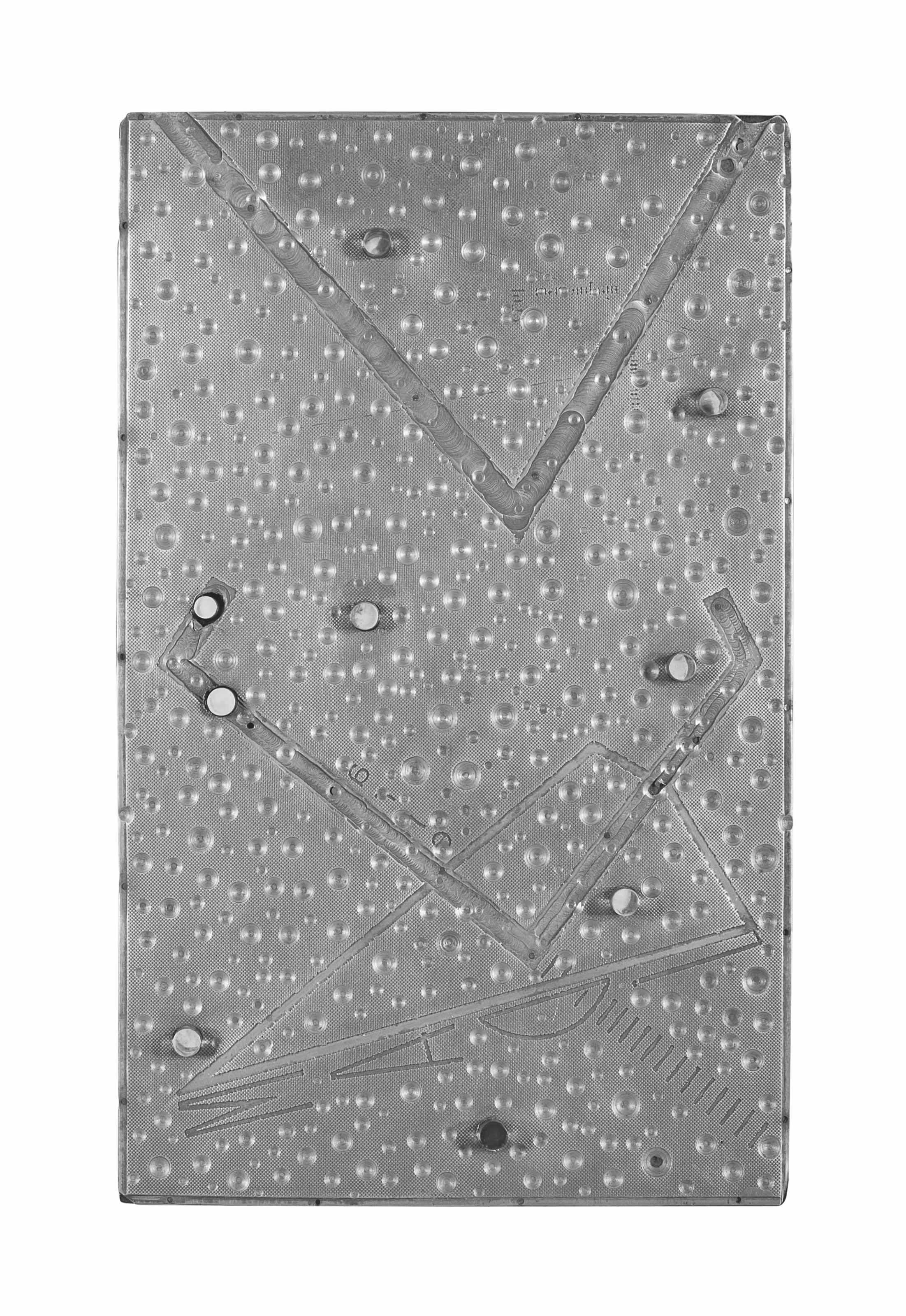 incised metal laid with plexiglass on panel