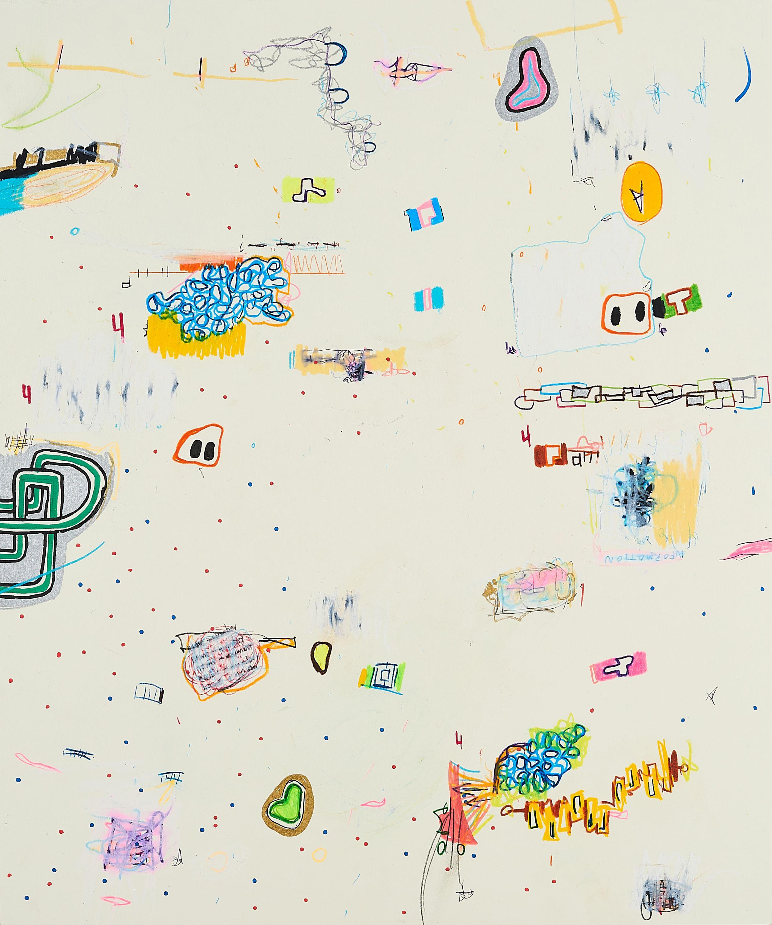 Bezeichnung: Signiert, datiert, betitelt und bezeichnet verso: JENS JONELEIT -FRINGE DWELLER- 59,5 cm x 49,5 cm (23 1/2 x 19 1/2) Colored Pencils, Oil+Wax Crayons, Paintmarkers - Graphite on Paper Berlin, June 2012 Jens Joneleit.