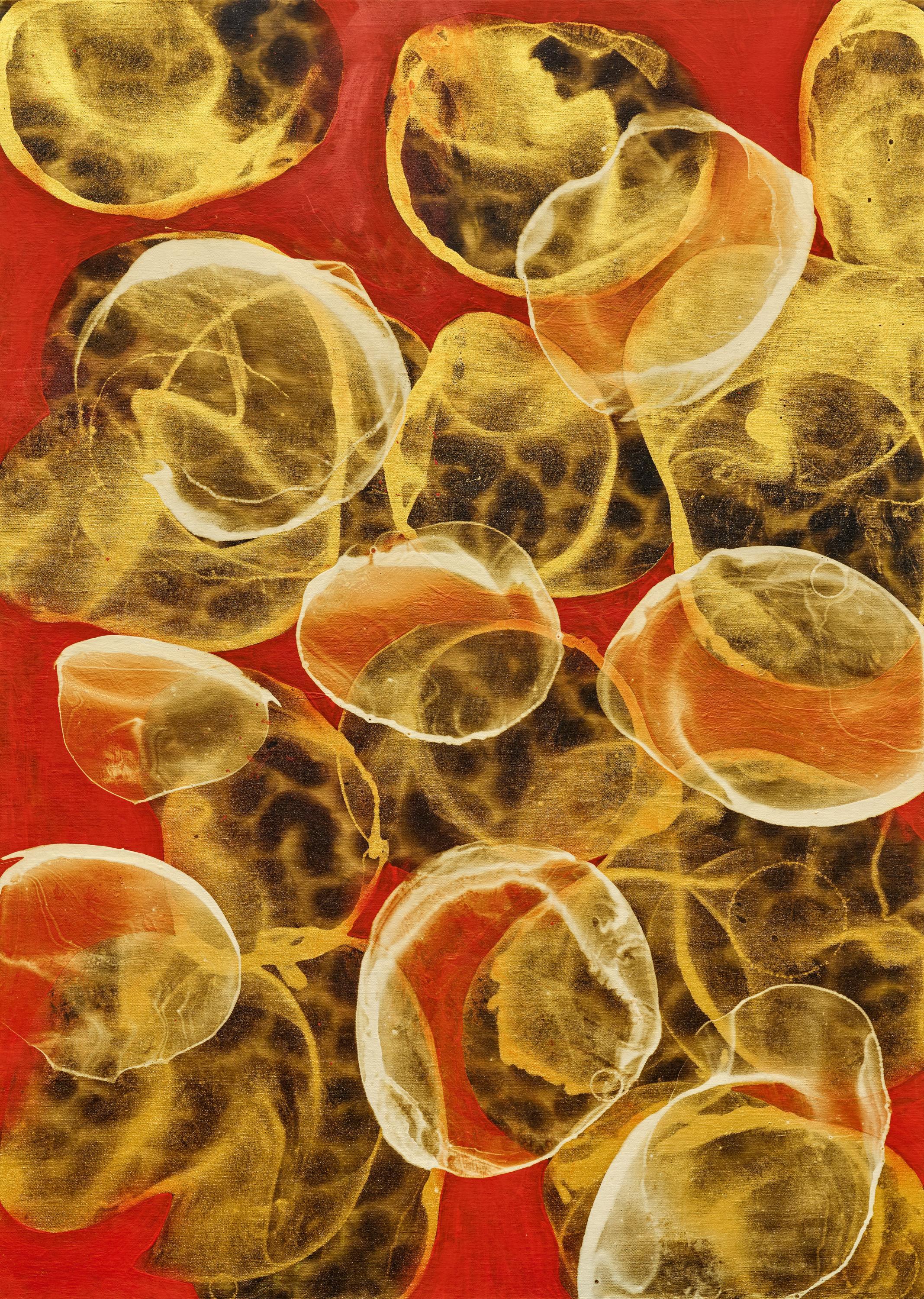 Technik: Seifenlauge, Pigment und Goldlack auf Leinwand.