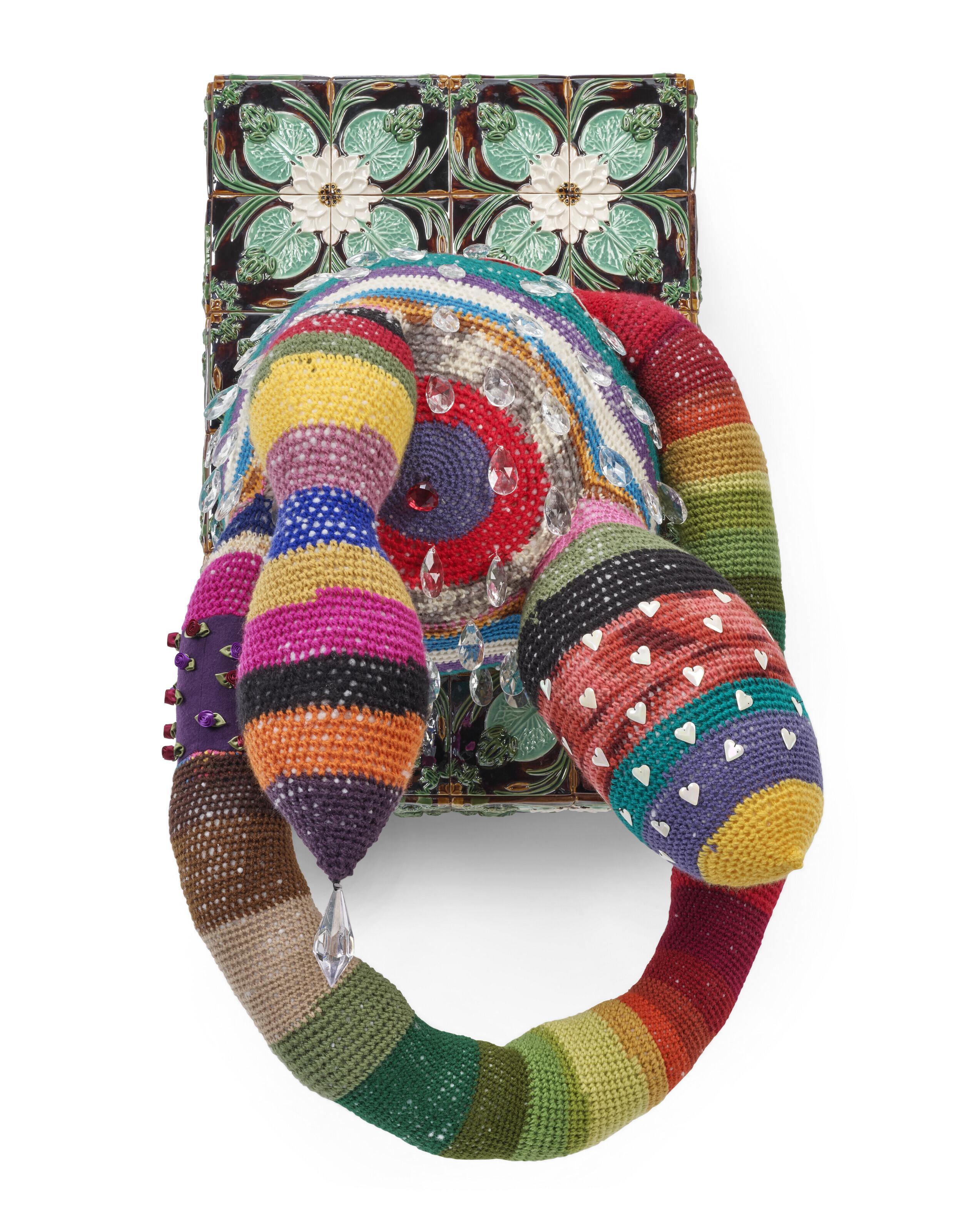 JOANA VASCONCELOS (B. 1971) Nénuphar crochet and mixed media on Rafael Bordalo Pinheiro glazed ceramic tiles 35 7 ⁄ 8 x 27 1 ⁄ 2 x 27 1 ⁄ 2 in. (91 x 70 x 70cm.) Executed in 2010