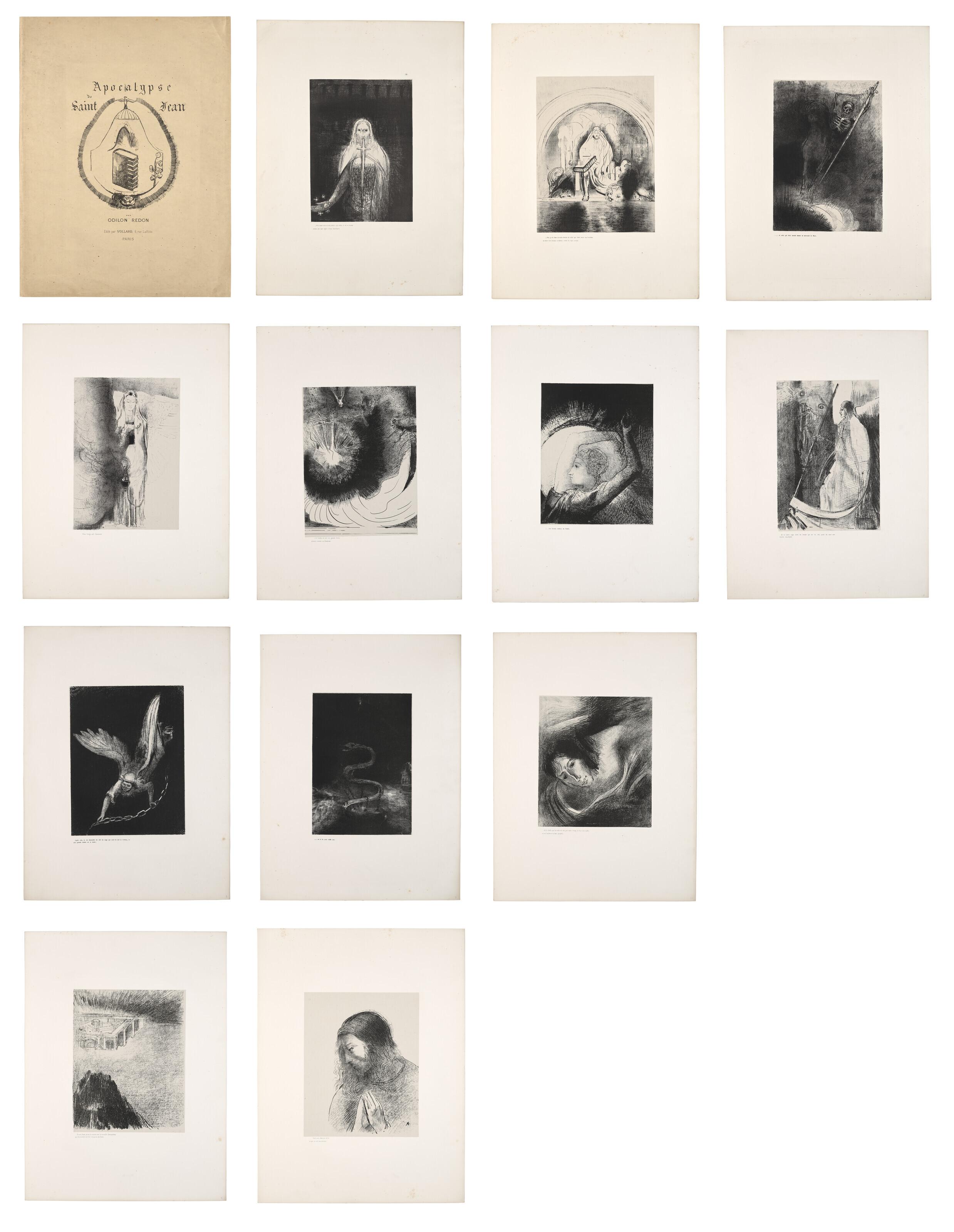 ODILON REDON (1840-1916) Apocalypse de Saint-Jean ensemble complet de douze lithographies, 1899, sur papier Chine appliqué sur papier vélin support, avec la couverture frontispice, album imprimé à cent exemplaires par Blanchard et édité par Ambroise Vollard, Paris, imprimée par Blanchard, Paris (album) ensemble des feuilles: 563 x 425 mm. couverture: 571 x 428 mm. the complete set of twelve lithographs, 1899, on Chine appliqué on wove paper support, with the cover/frontispiece, from the edition of one hundred, published by Ambroise Vollard, Paris, printed by Blanchard, Paris (album) sheets: 563 x 425 mm. cover: 571 x 428 mm.