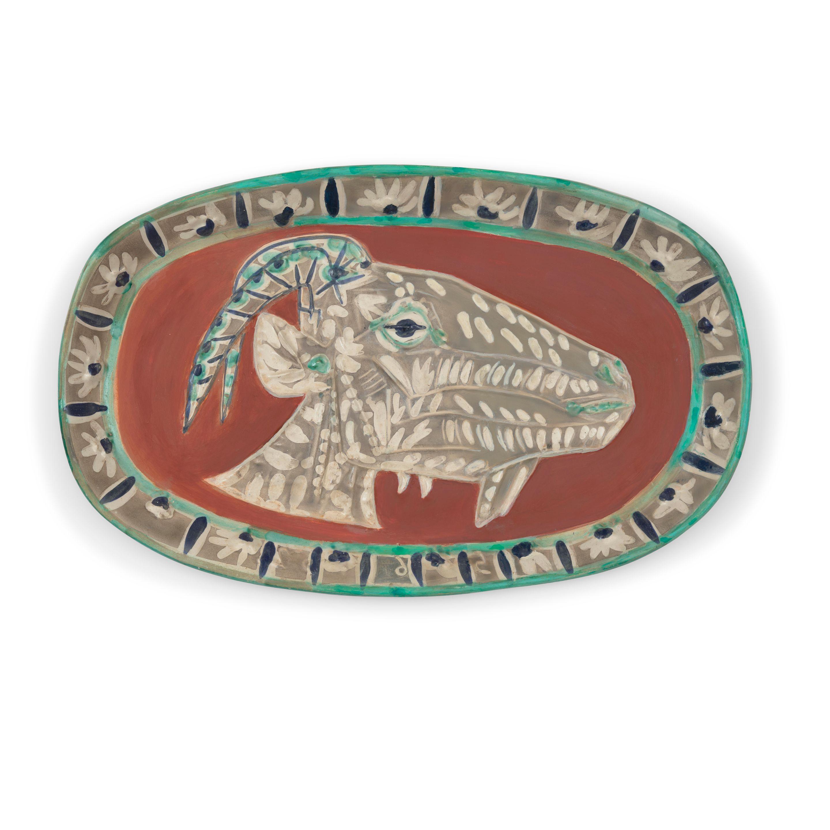 Partially glazed white earthenware clay dish painted in russet, grege, green, grey and patina, from the edition of 250, with the 'Empreinte Originale de Picasso' and 'Madoura Plein Feu' pottery stamps on the underside.