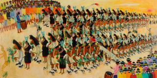 Pueblo; and Indians by a pueblo, rainbow and storm