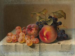 Emilie Preyer - Stillleben mit Pflaumen, Trauben und Pfirsichen auf weißer Tischdecke