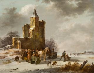 Winterlandschaft mit Schlittschuhläufern vor einer Ruine.