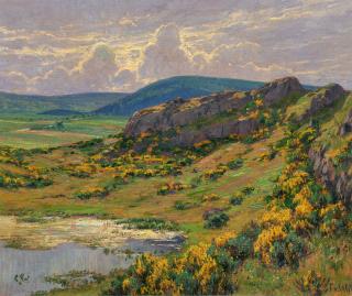 Title: Blüten (Stockrosen), Blick auf den Rhein bei Wittlaer