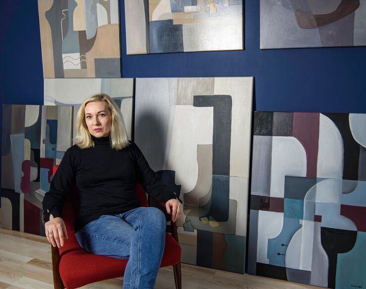 Agnieszka Krawczyk devotes herself to the classic motif of the still life in traditional painting with oil on canvas and yet gives expression to a completely new, modern pictorial language. Physical objects such as bottles, glasses, fruit and instruments are projected onto the flat plane in strong geometric abstraction, largely represented only by their outlines. Thus they meet, touch and overlap, form intersections, simulate a spatial depth by merging the colors, whereby foreground and background often remain interchangeable. The surrounding space is also projected onto the plane, dissected into large areas of color that merge with the objects of the still life. The entire pictorial space is thus worked out, divided into color fields.