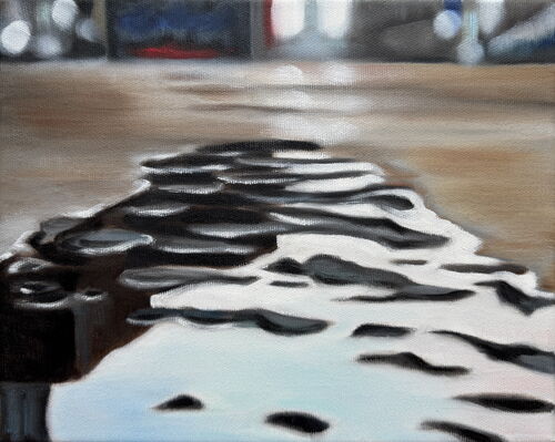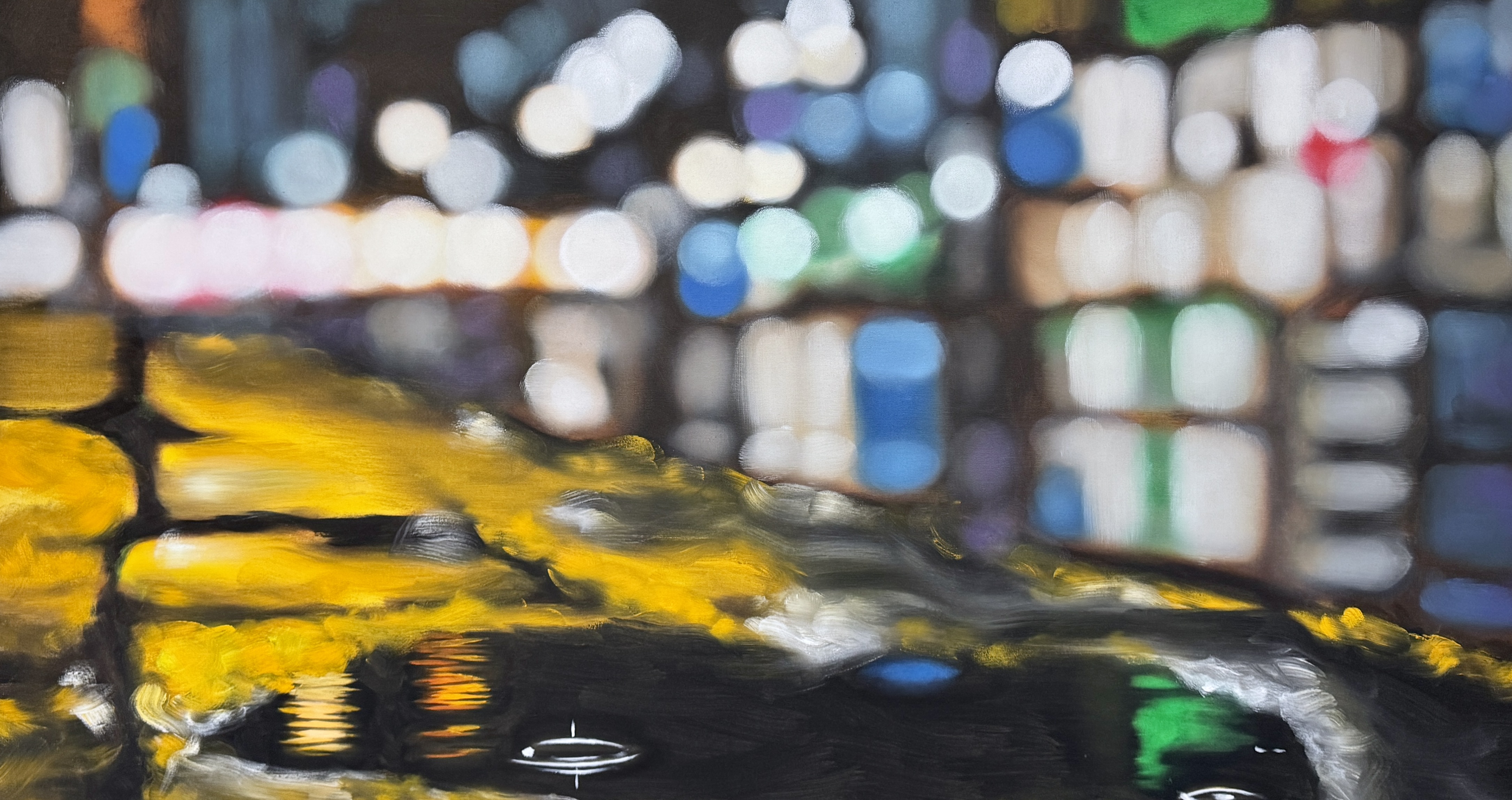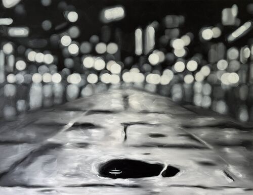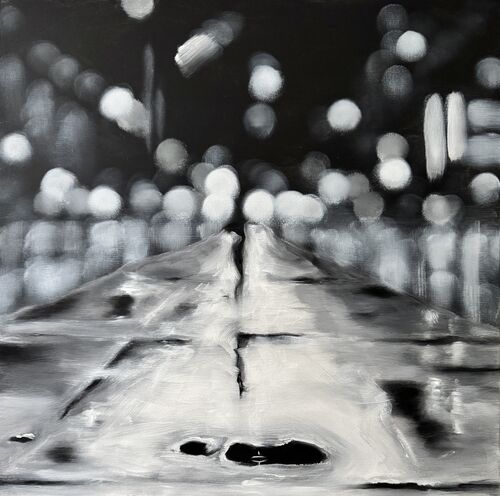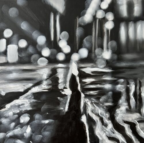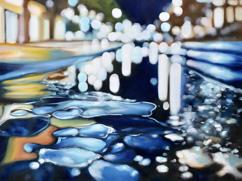 In den Bildern von Angela Wichmann ist es oft tiefe Nacht und doch alles andere als dunkel. Tanzende Lichter, schimmernde Spiegelungen und funkelnde Reflexionen bestimmen den Schauplatz, erzählen ihre eigene Geschichte, machen die Leinwand zu ihrer Bühne und sich selbst zu den Protagonisten der Szenerie.