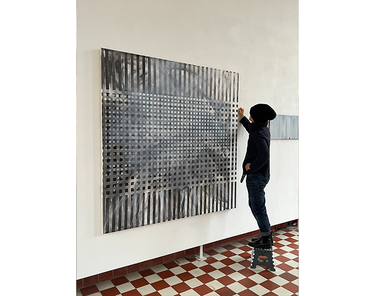 A second group of works in the exhibition also plays with the relationship between pictorial space, pictorial surface and depth of perspective. The grid is elementary here. If I referred at the beginning to the art-historical tradition of the line, something similar applies to the grid. Leon Battista Alberti, who saw the painting as a window to the world, was only able to do this by using the grid - no longer visible in the final painting - as an underlying auxiliary construction to enable perspective depictions. Centuries later, in the wake of classical modernism, the grid itself became a pictorial object and the basis of theoretical reflection in 20th century art history and art theory. The grid was repeatedly used to explore the relationship between realistic and abstract painting and to thematize their relationship to the flat picture surface. The American theorist Rosalind Krauss expressed it as follows in 1978: