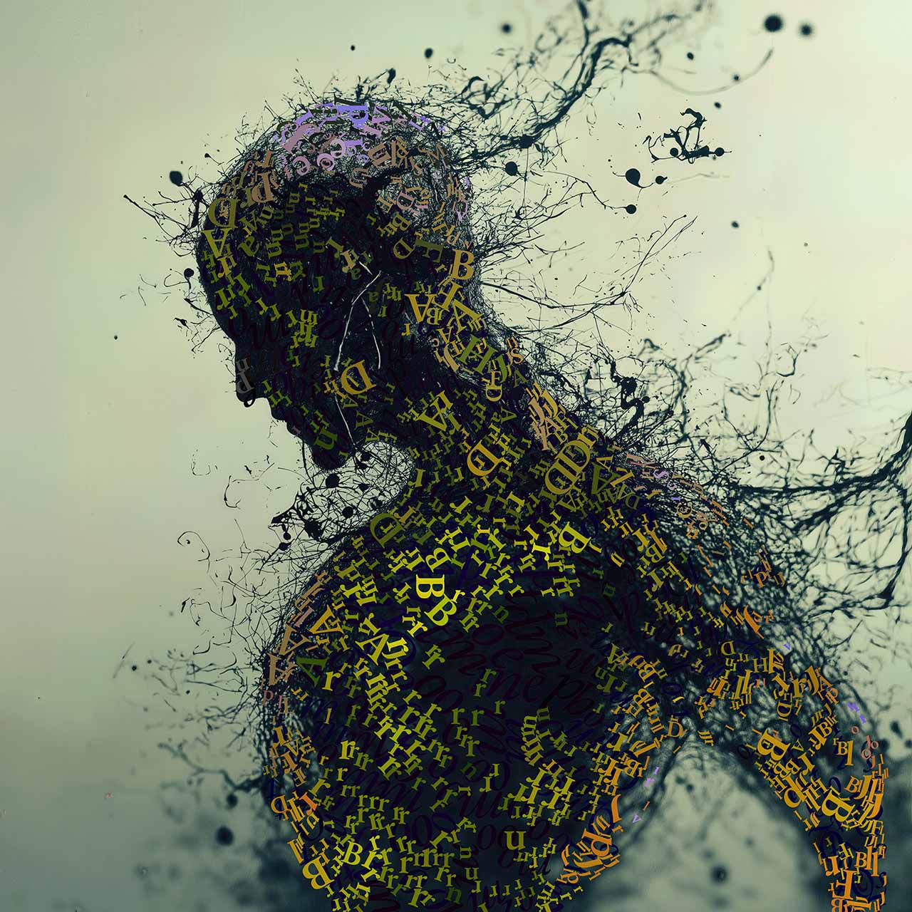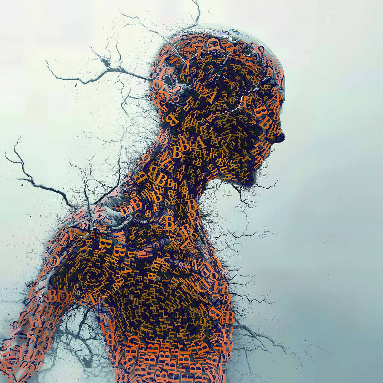 In Lexicon, the human figure stands distinct and silent, immersed in a cold and rarefied light. The body, once again devoid of flesh, is constructed from a dense network of letters — primarily in shades of orange and fiery red — that seem to pulse like linguistic cells. Each typographic sign appears not only as a visual ornament, but as an emotional trace, a mnemonic echo of lived experience. The individual is portrayed in an almost meditative state: composed, contained, listening to their own inner silence.