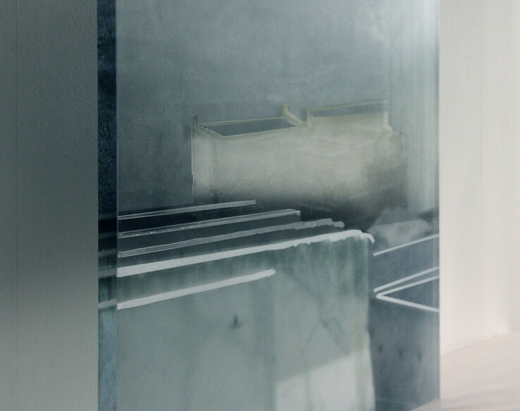 In her multi-layered works, Christiane Fleissner shows the superimposition of time and space, of moods and results, which she partially laminates directly as a photo on different Plexiglas panes or places behind them. The surface texture features matt surfaces and glossy areas - blurring the foreground and "zooming in" on the layers behind. Fleissner's "event landscapes" turn the viewer into a traveler through time and space: in old factory landscapes, the plaster is peeling off the walls and deep puddles have formed on the floor, reflecting window panes and doors - of the same room, or does another level open up, a deeper, past layer? You are not sure which time zone you are in. How does the trained sculptor use photographic means - by montage or double exposure?