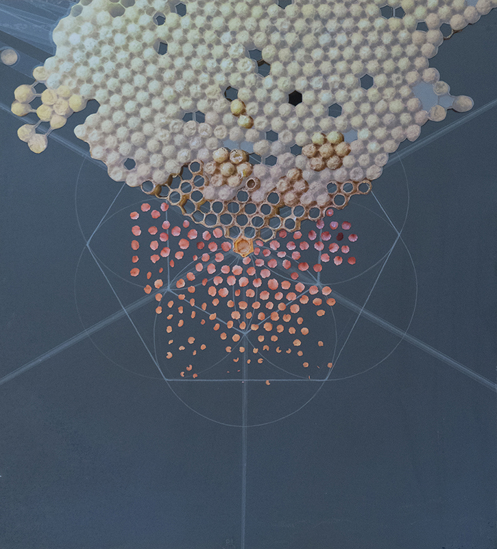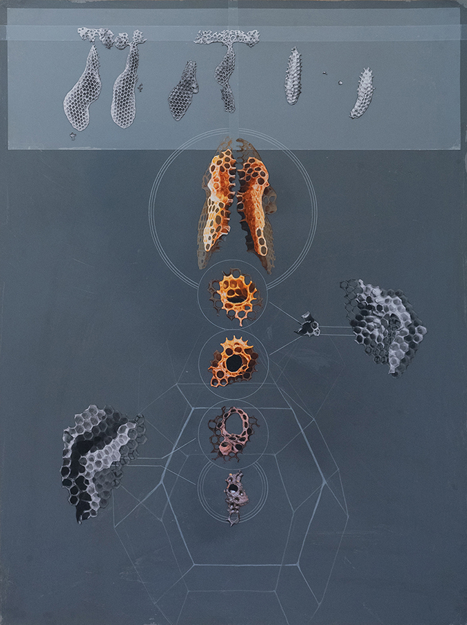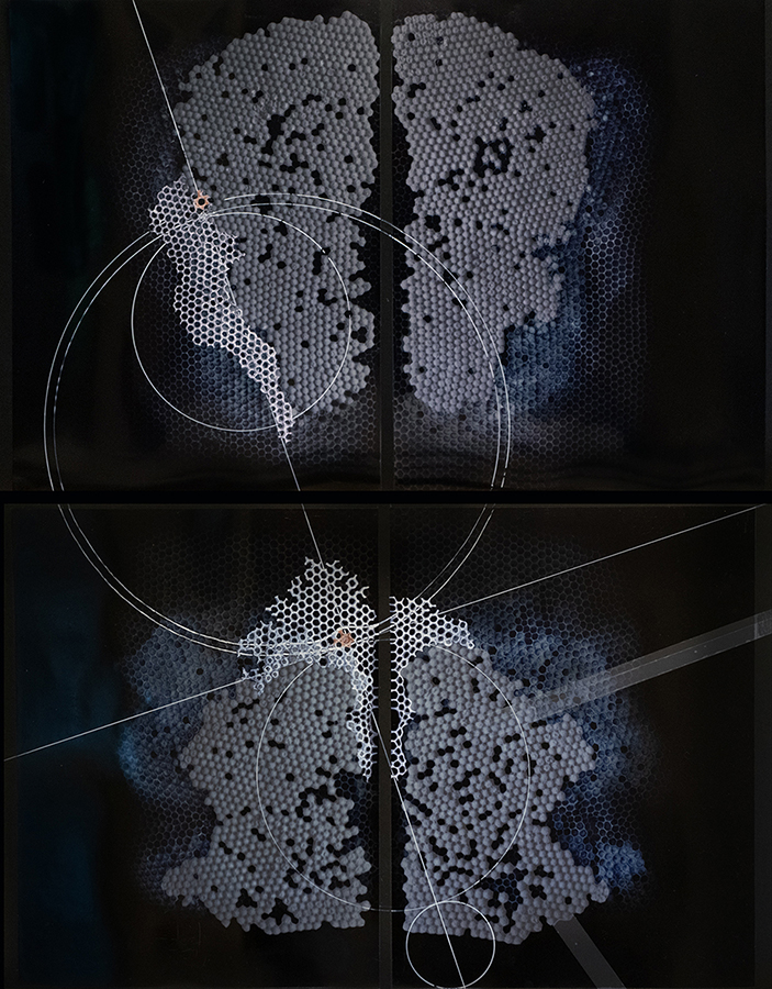 This series is about the space in the beehive. About organization and flexibility, order versus the joy of playing. Starting from the clear, geometric basic shape of the honeycomb structure, you discover the smaller and larger deviations in perfection. The principles developed over many millennia guarantee a high level of effectiveness, but as you can clearly see in the bee colony, they are never rigid. Everything is reinterpreted again and moves within certain limits scales, organic. Disturbances/changes are noticed and further developed.