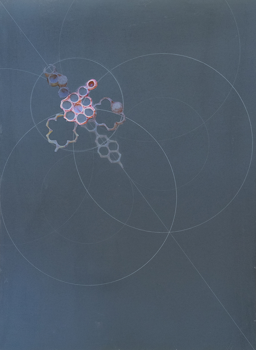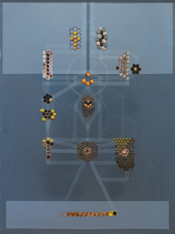 This series is about the space in the beehive. About organization and flexibility, order versus the joy of playing. Starting from the clear, geometric basic shape of the honeycomb structure, you discover the smaller and larger deviations in perfection. The principles developed over many millennia guarantee a high level of effectiveness, but as you can clearly see in the bee colony, they are never rigid. Everything is reinterpreted again and moves within certain limits scales, organic. Disturbances/changes are noticed and further developed.