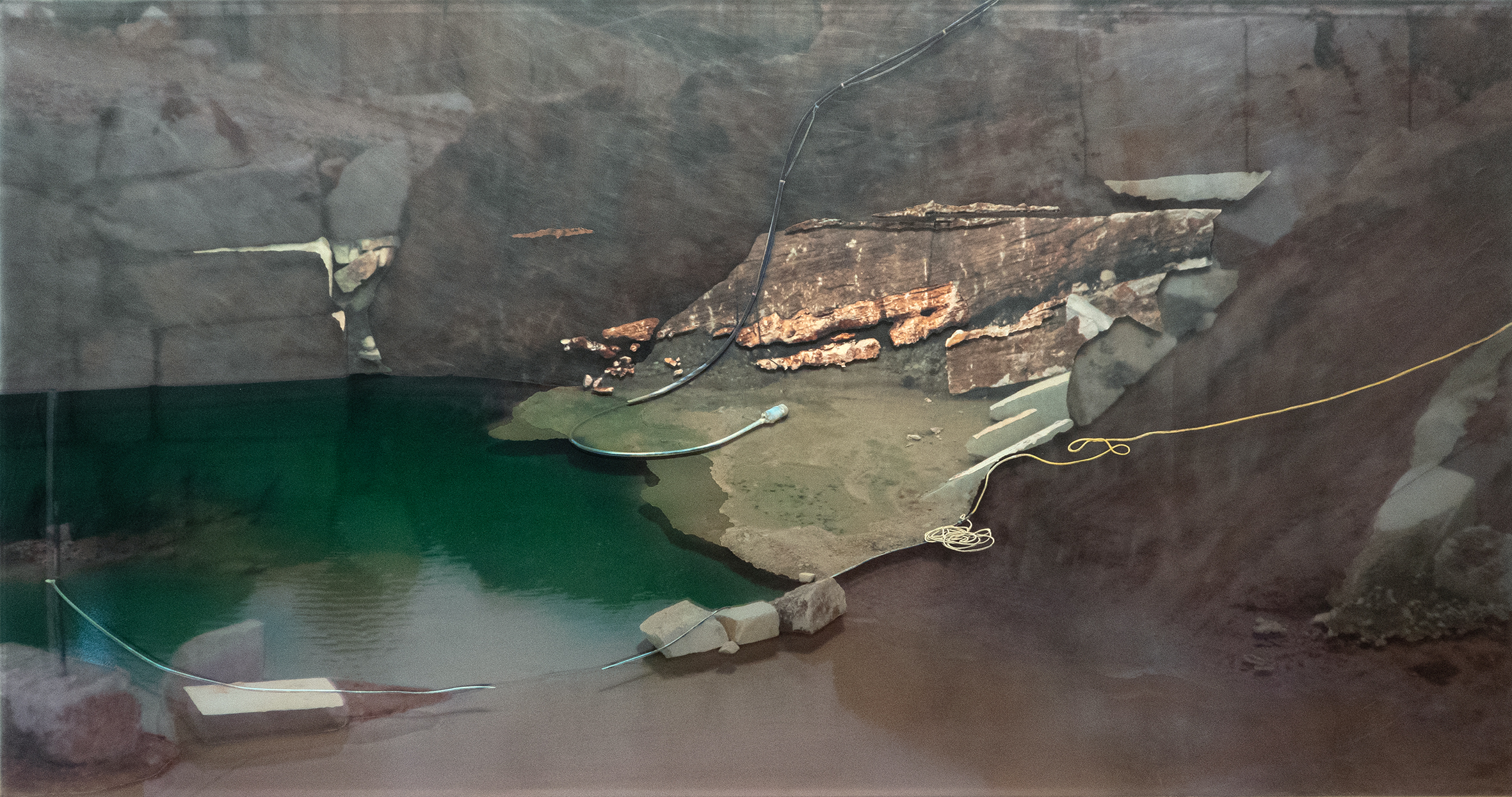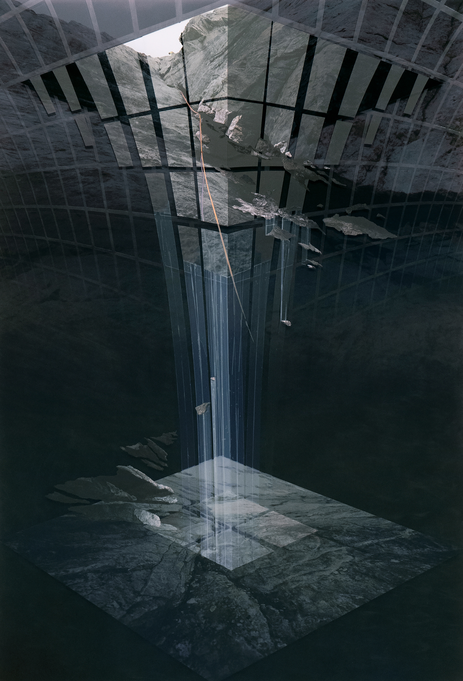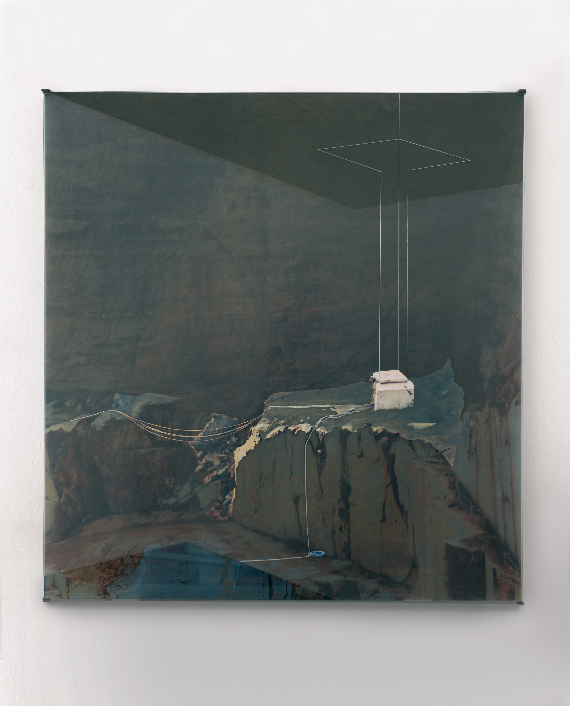 A glass panel leaning against the wall shows a photo print of an abyss taken on a mountain hike. The spatial dimensions of the motif are broken up by the transparency of the print with the clear structure of the wall and floor.