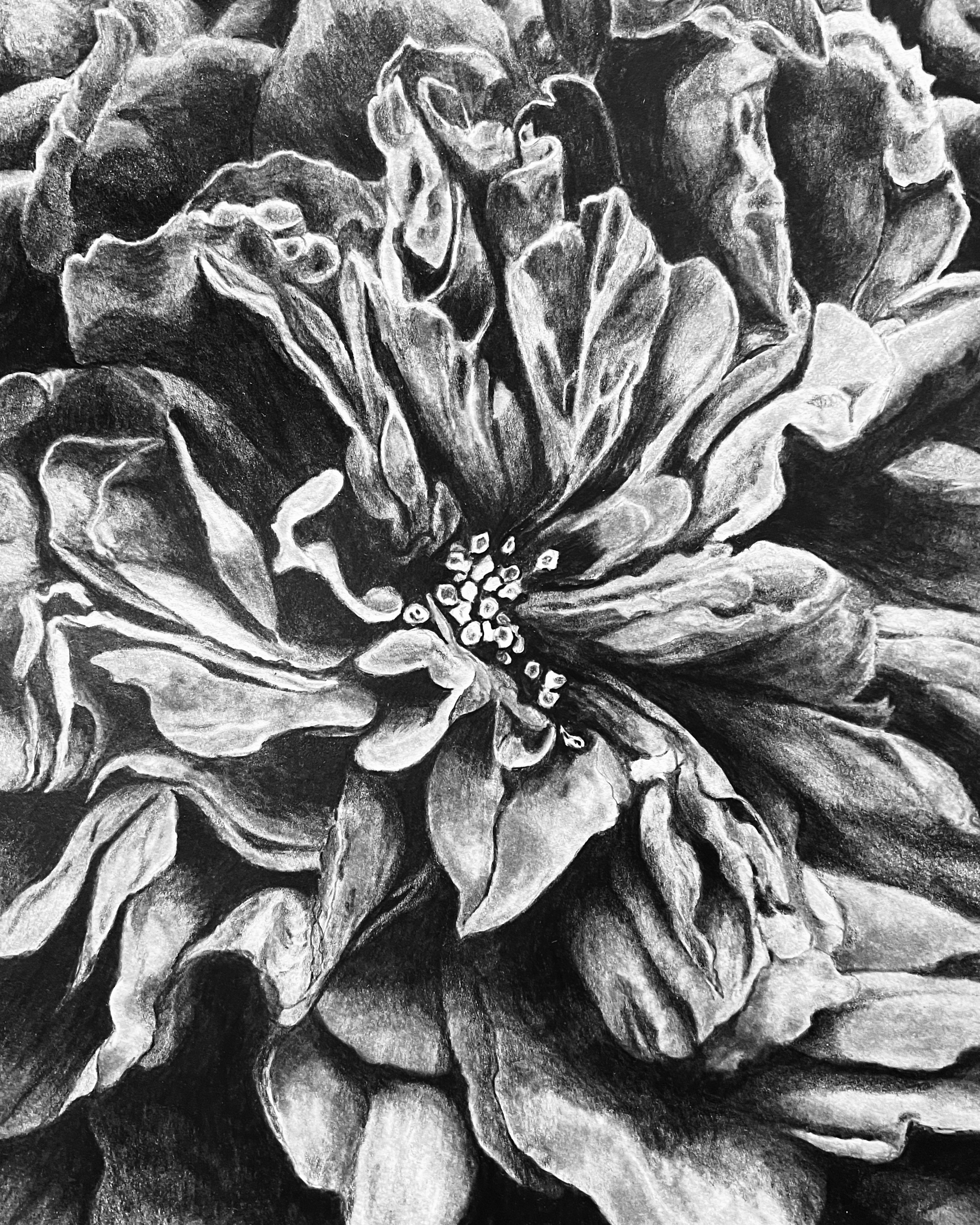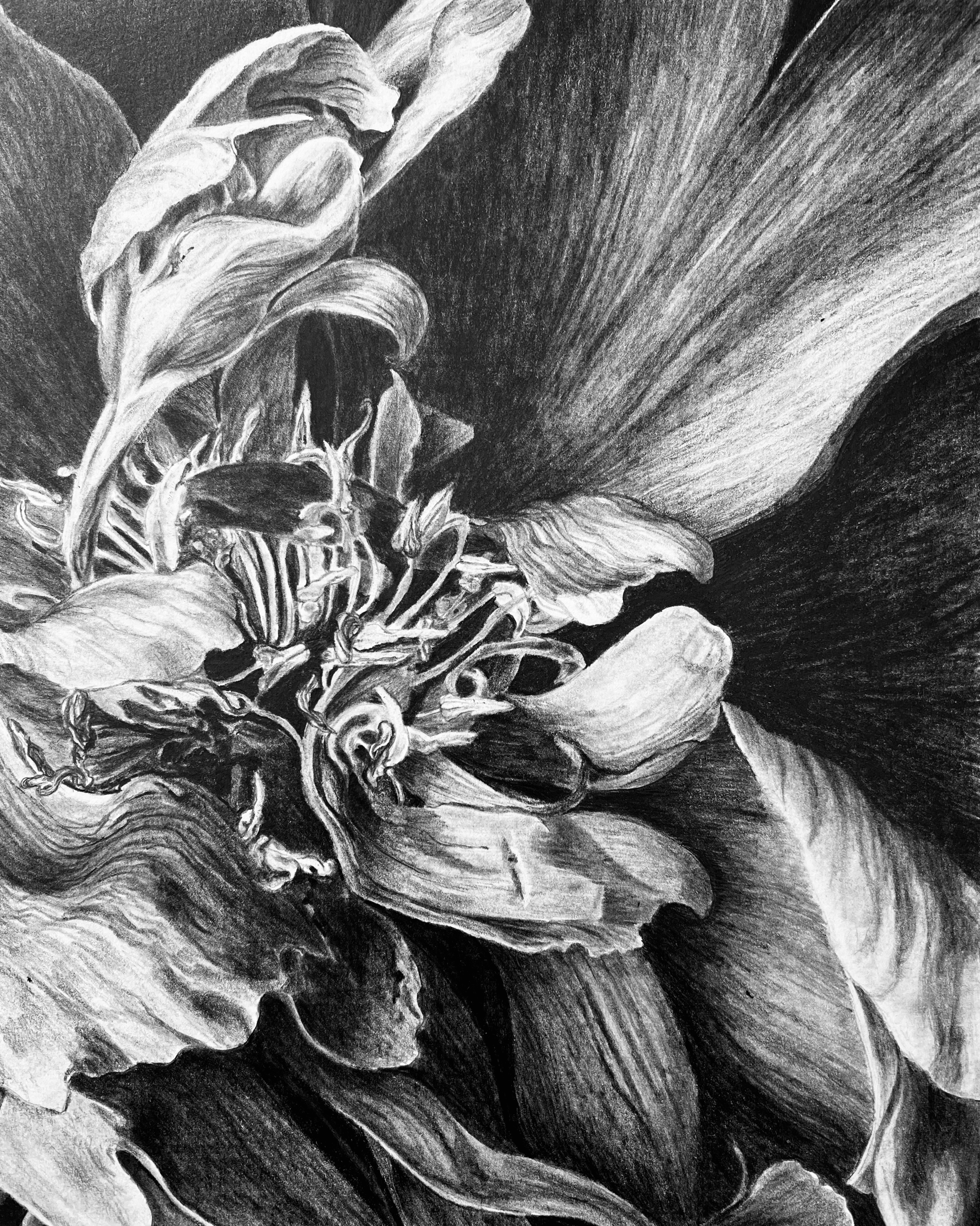 The drawing shows a peony slowly fading. Its petals seem to dance, trying to catch the eye. Even though its time is almost over, it still wants to be noticed. Dressed like for a ball, with the scent of strong perfume — now, as it withers, it appears even more vivid and emotional.