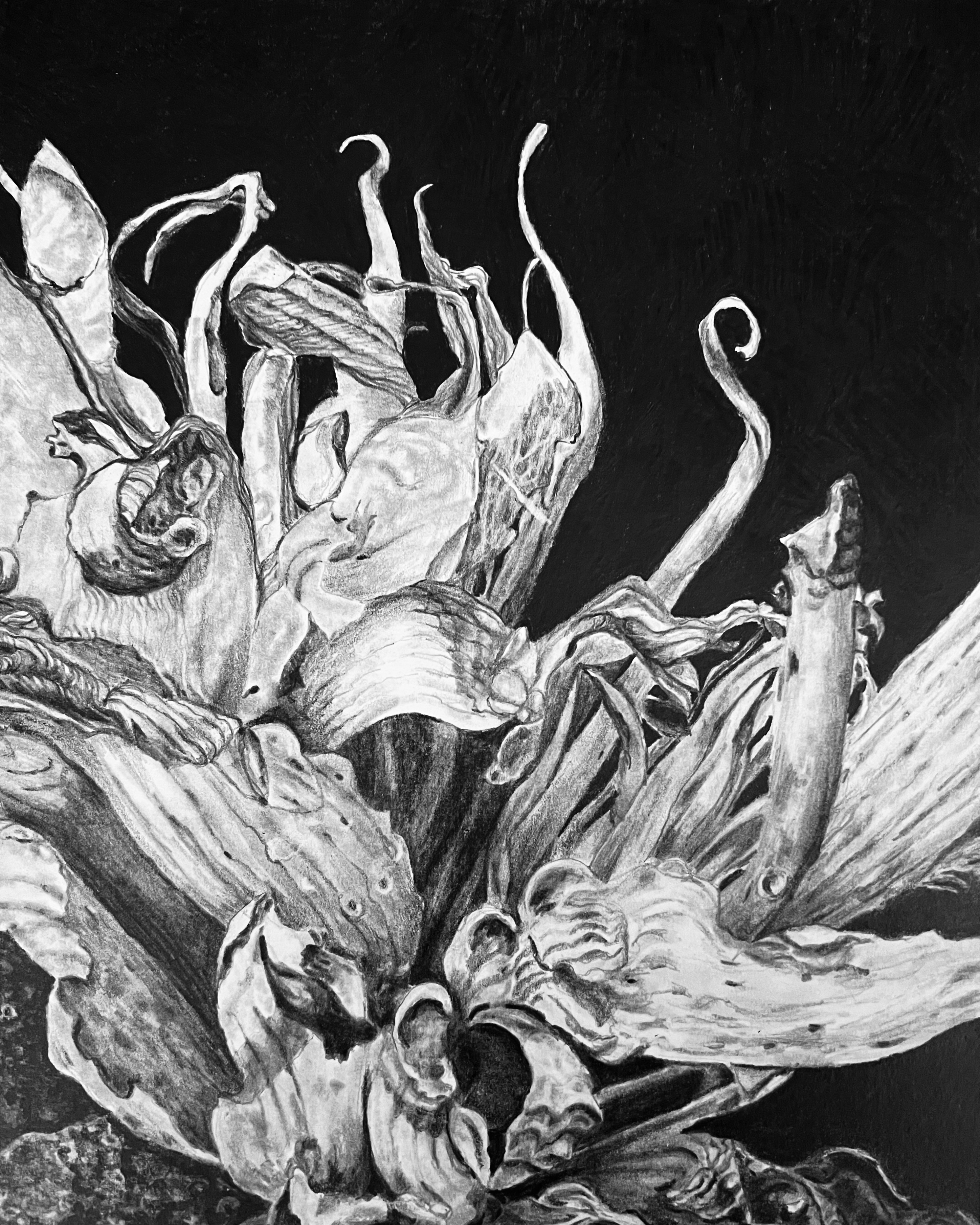 A drawing of a flower in full bloom, saturated with moisture after a summer rain. It evokes a sense of longing and intimate moments. A memory from a walk in the Botanical Garden in Wrocław.