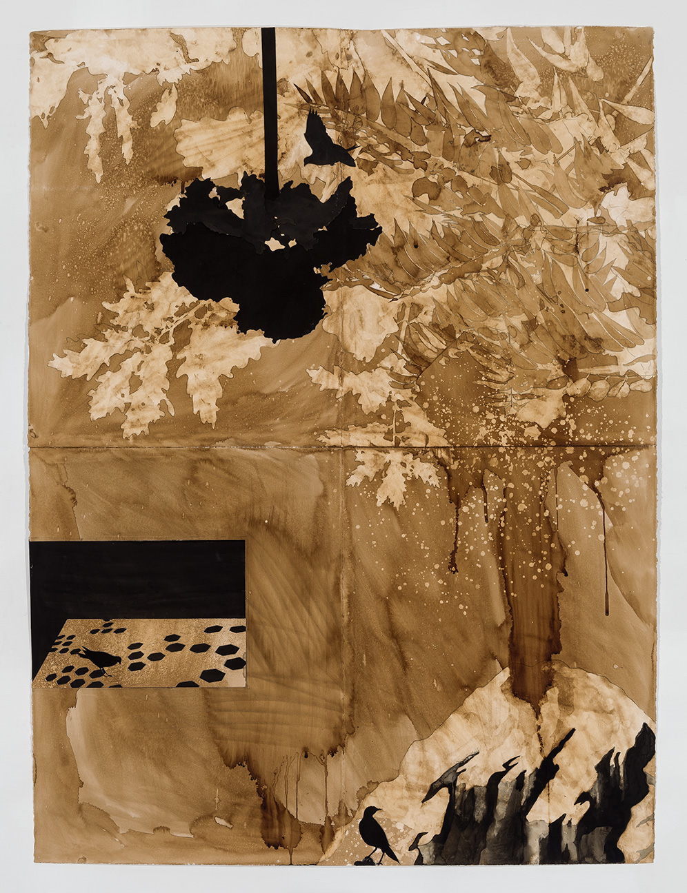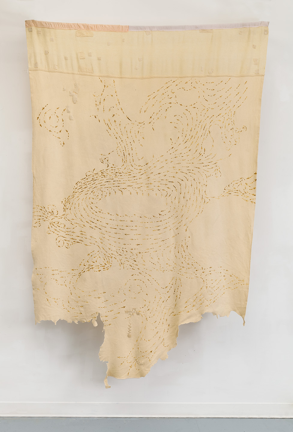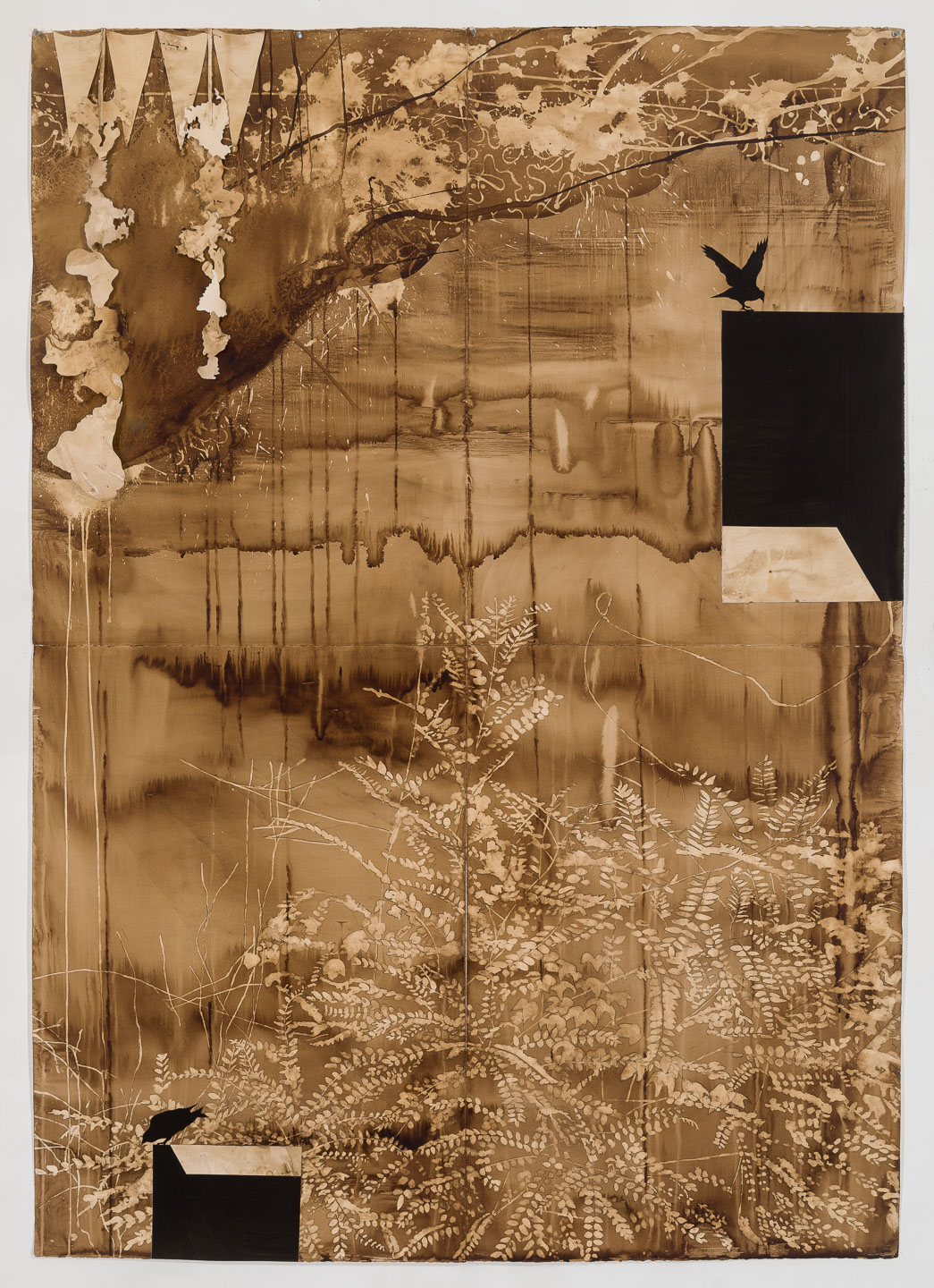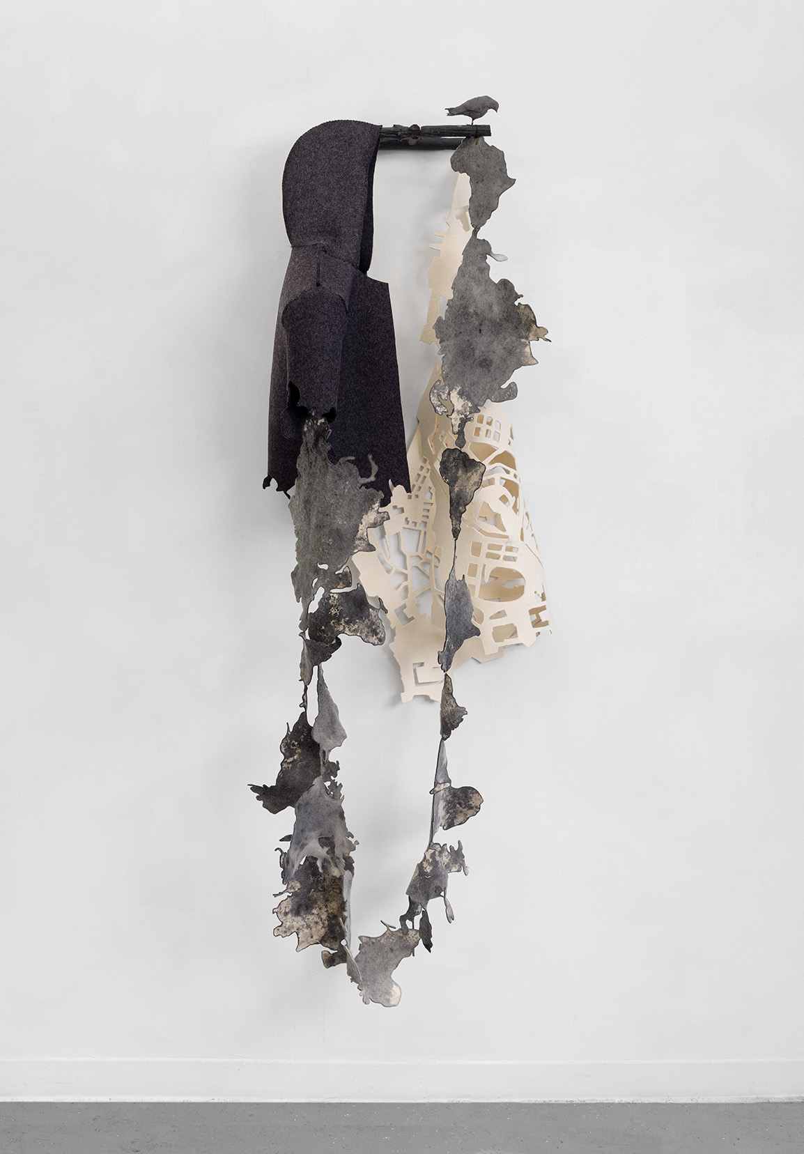 A small woolen hooded jacket with the edges of maps cut into the hems, hangs on a branch. Maps of all the continents of the world fall from a sleeve and hang on the opposite end of the branch. A fragment of a woolen blanket cut into the map of an urban plan hangs from a branch behind these maps. A small bird, as if seen from a great distance, overlooks the maps below.