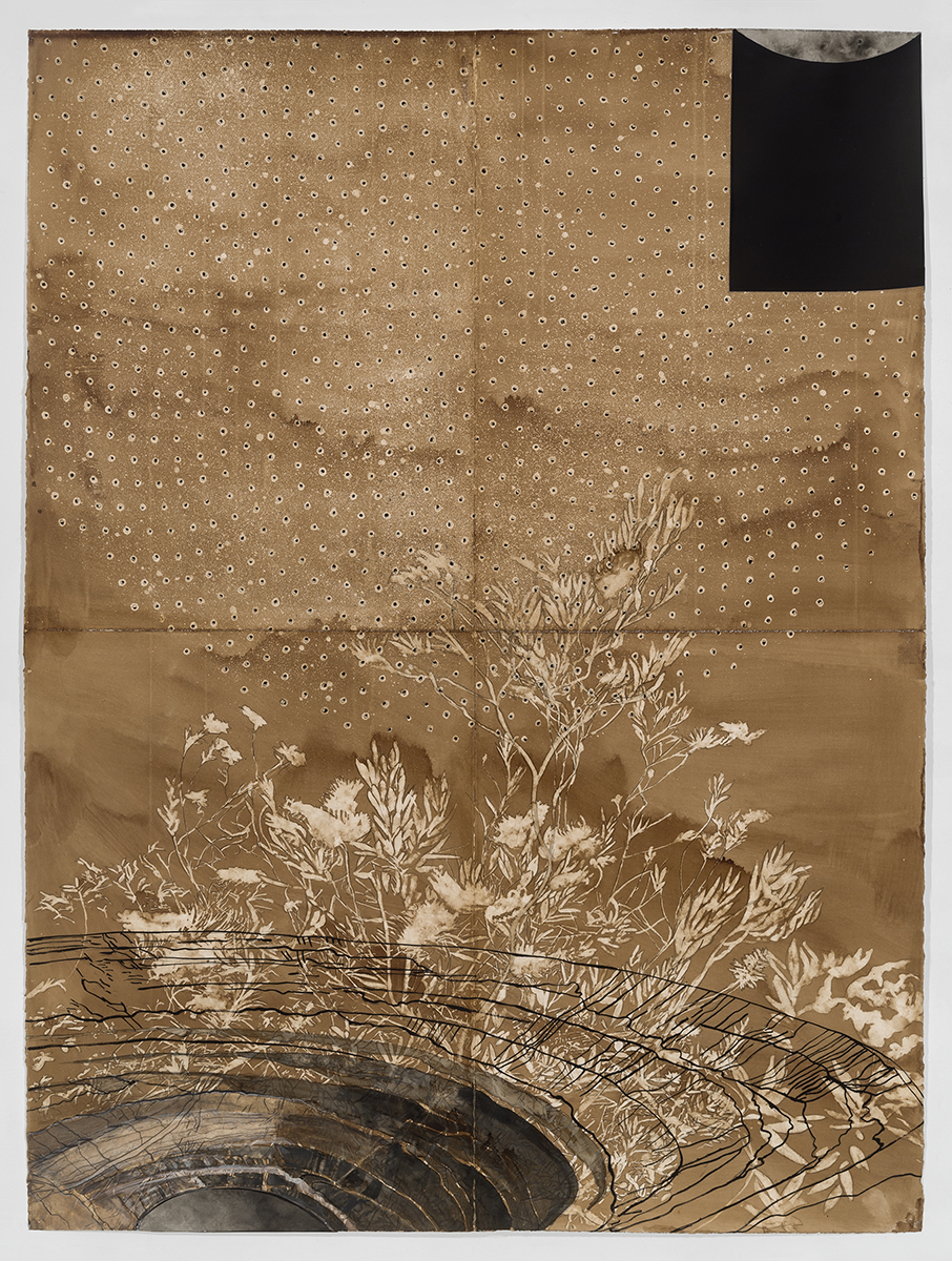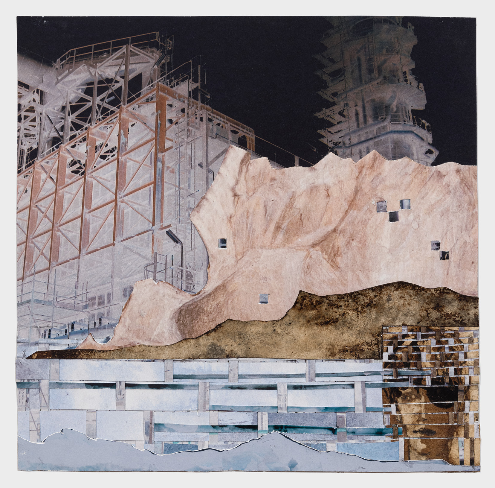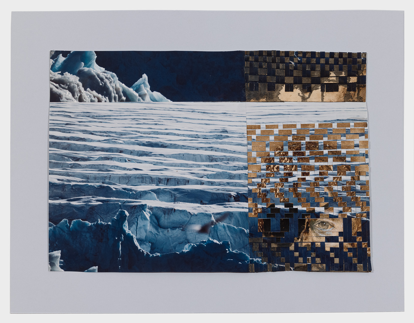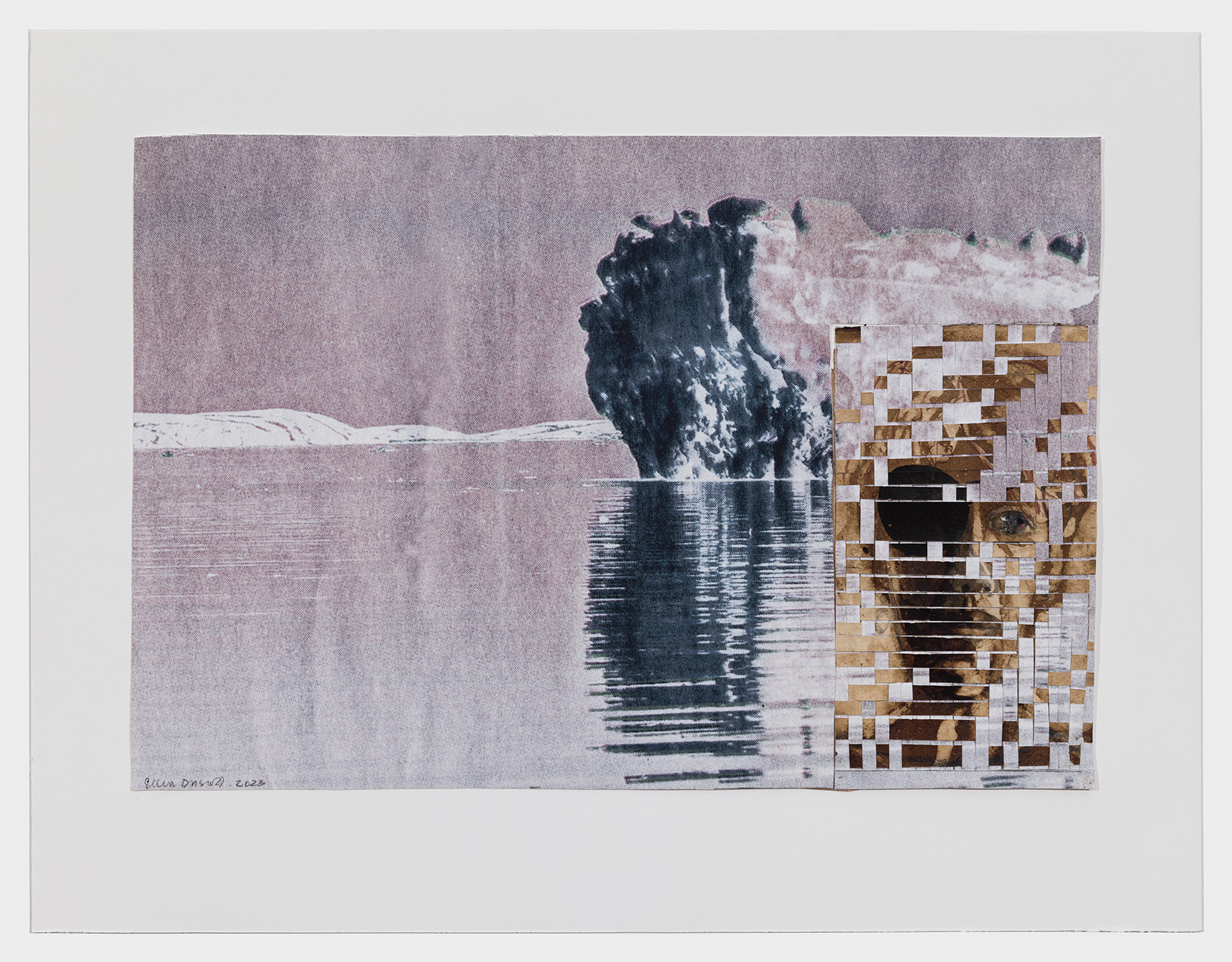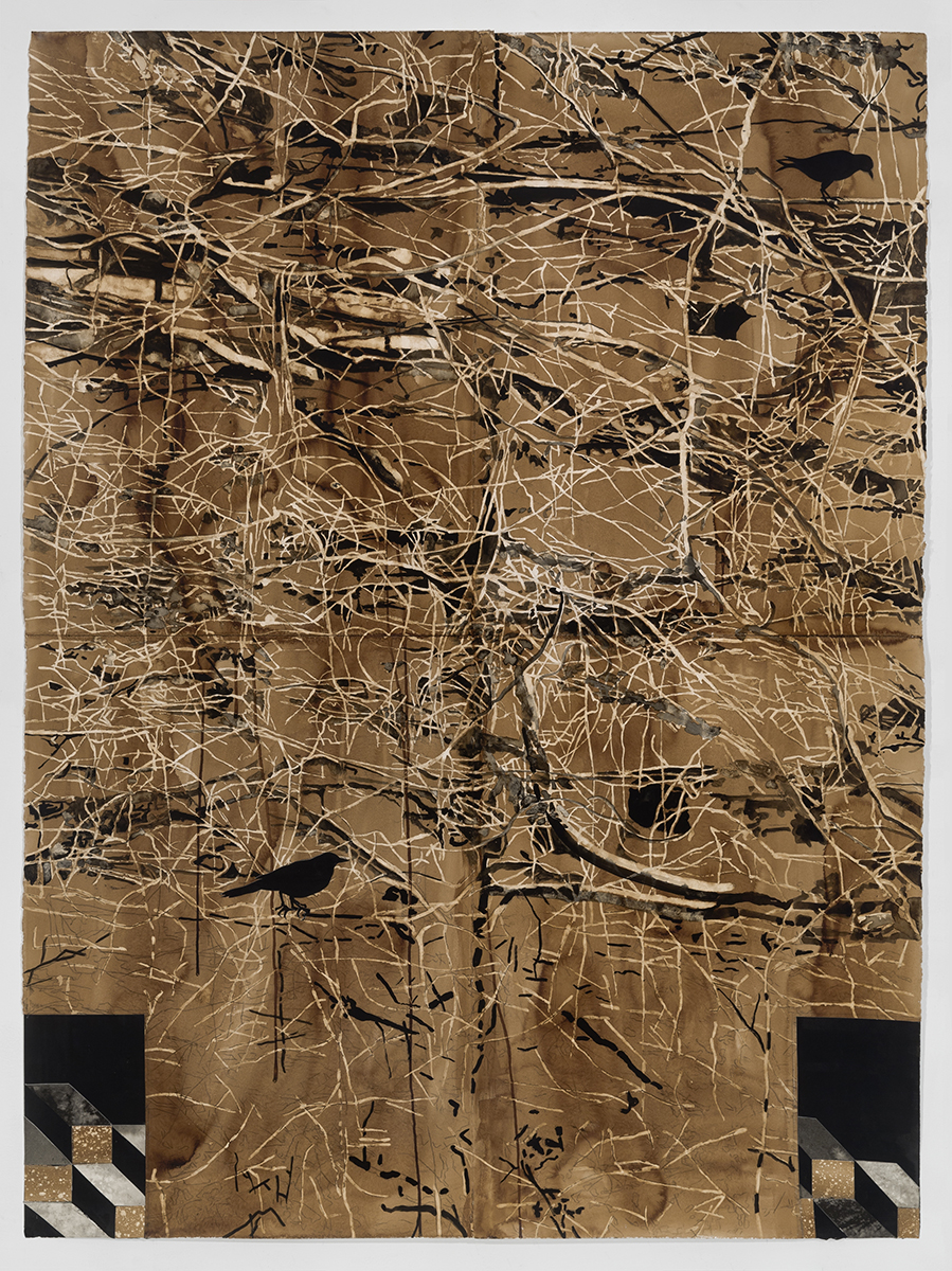 A small woolen hooded jacket with the edges of maps cut into the hems, hangs on a branch. Maps of all the continents of the world fall from a sleeve and hang on the opposite end of the branch. A fragment of a woolen blanket cut into the map of an urban plan hangs from a branch behind these maps. A small bird, as if seen from a great distance, overlooks the maps below.