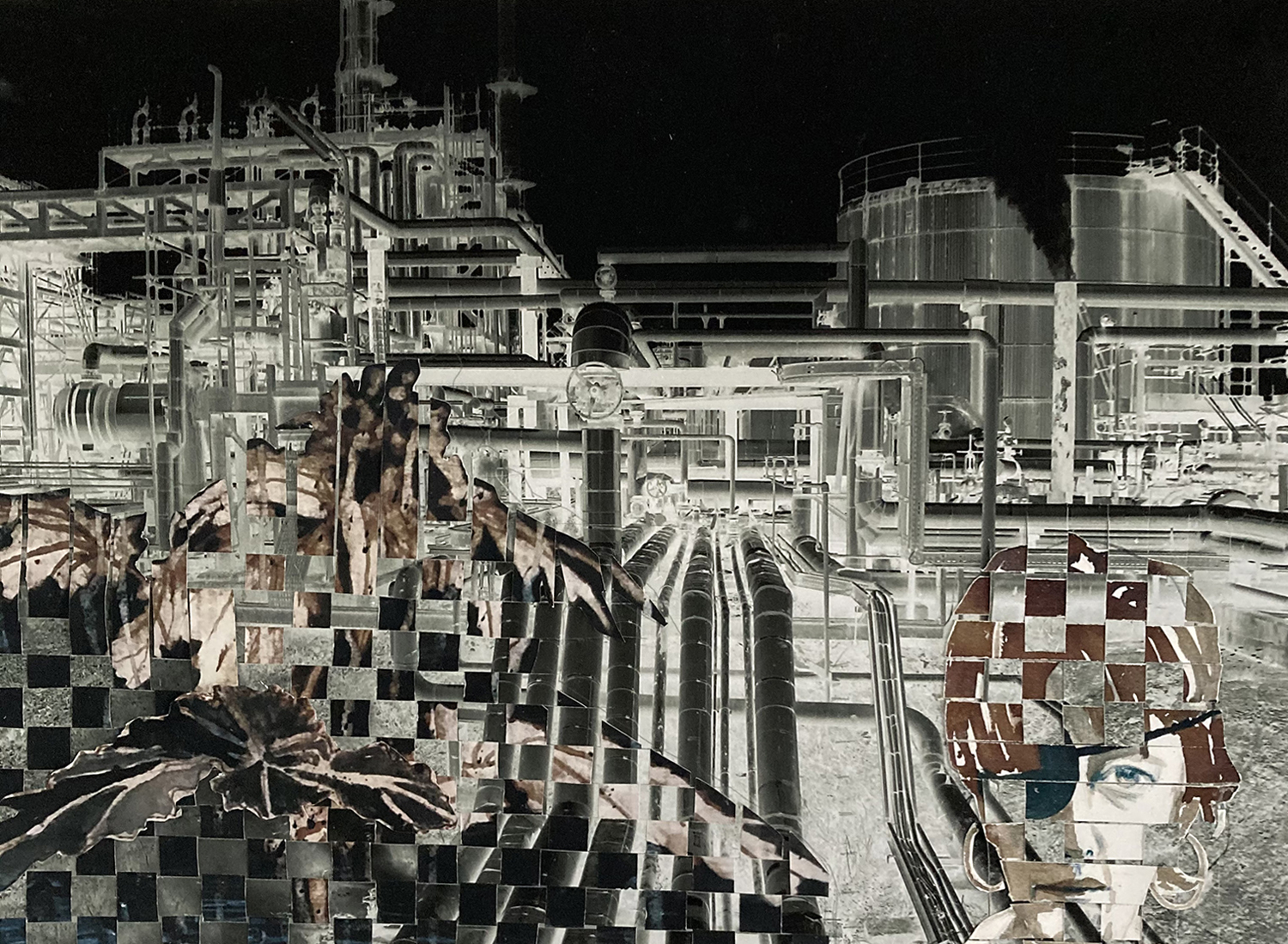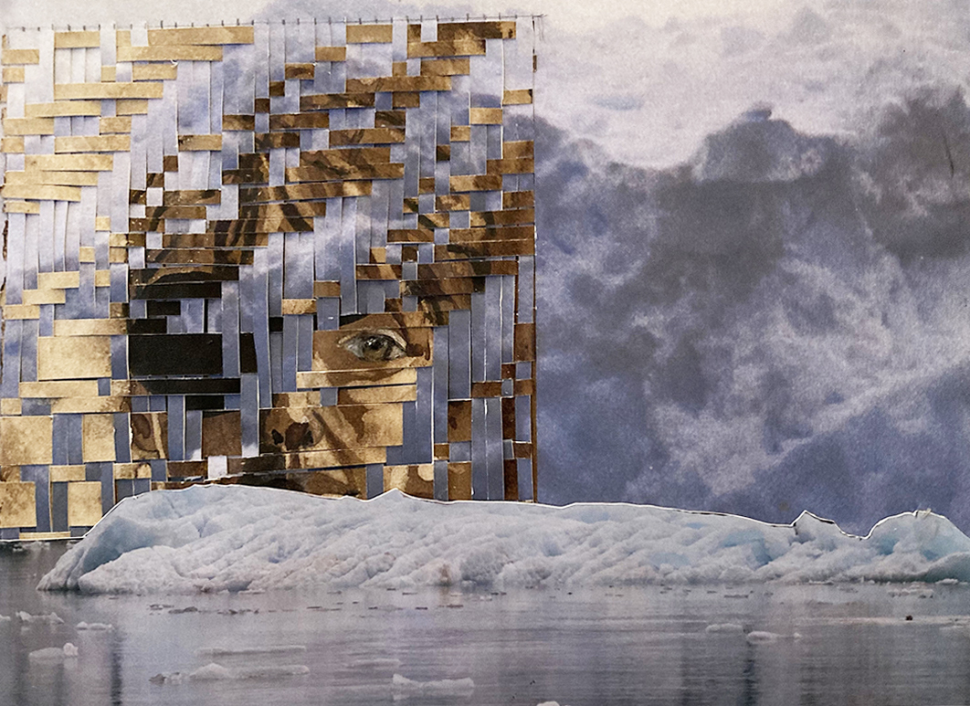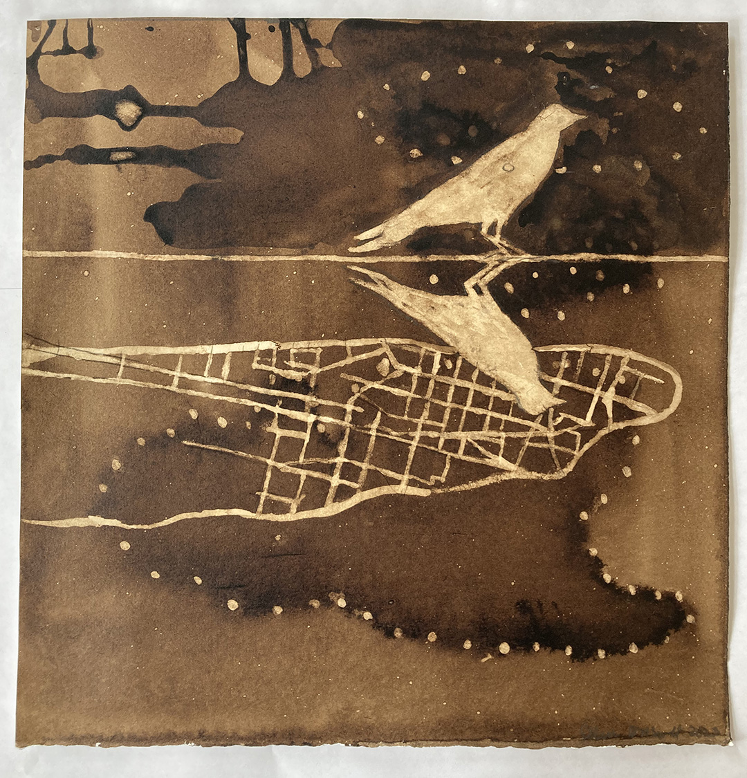 A child's hooded jacket made from maps of the world, hangs on a branch. From both sleeves cascade the maps of the continents of the world, falling and rising to hang on the opposite end of the branch. A bird perches on the branch, looking down. The implied figure is in stasis, in between departure and destination.