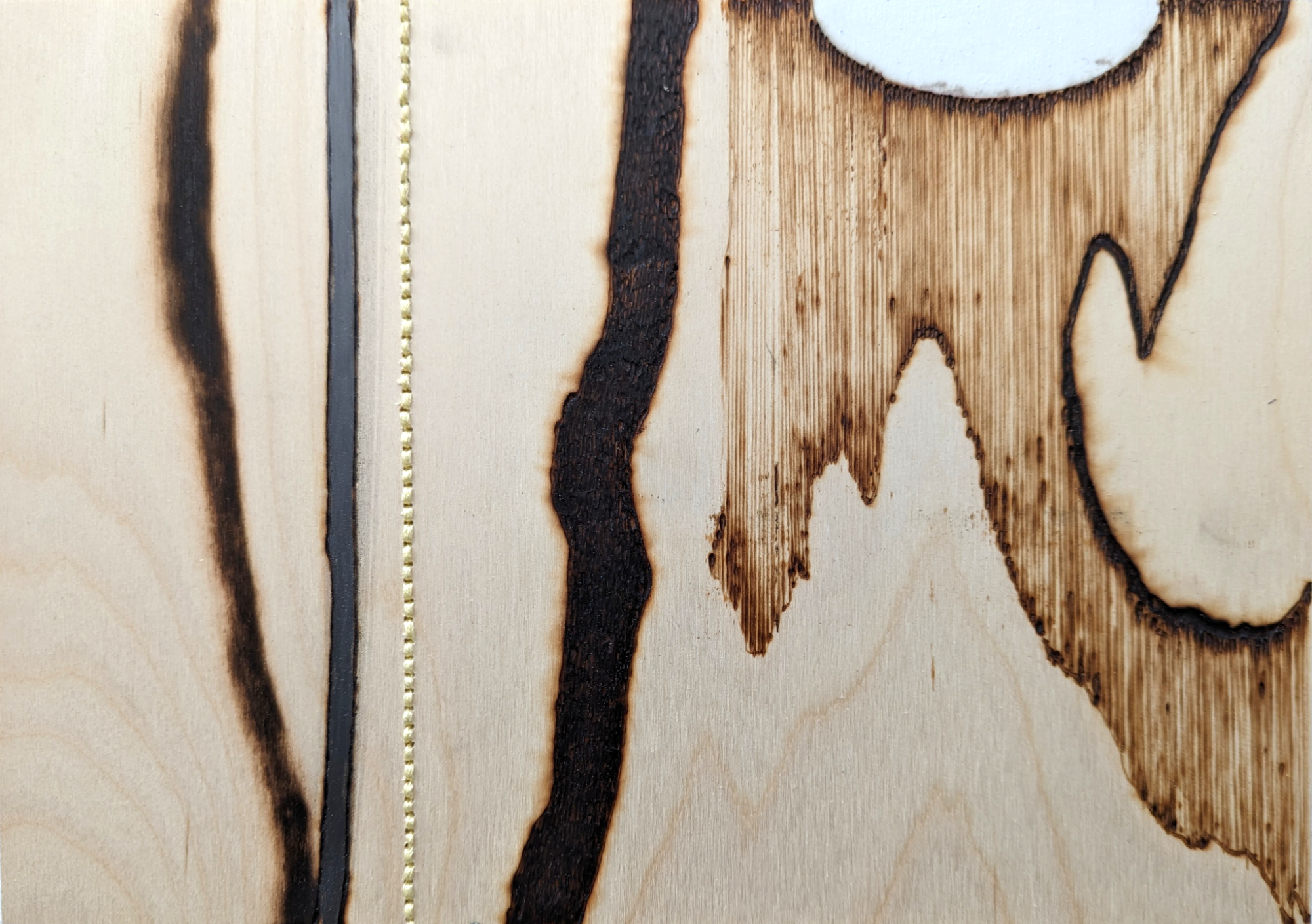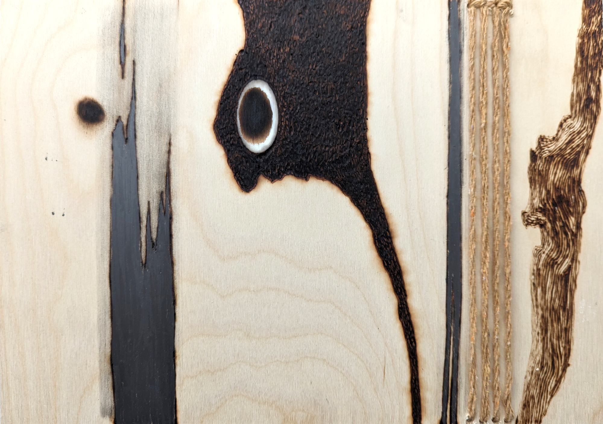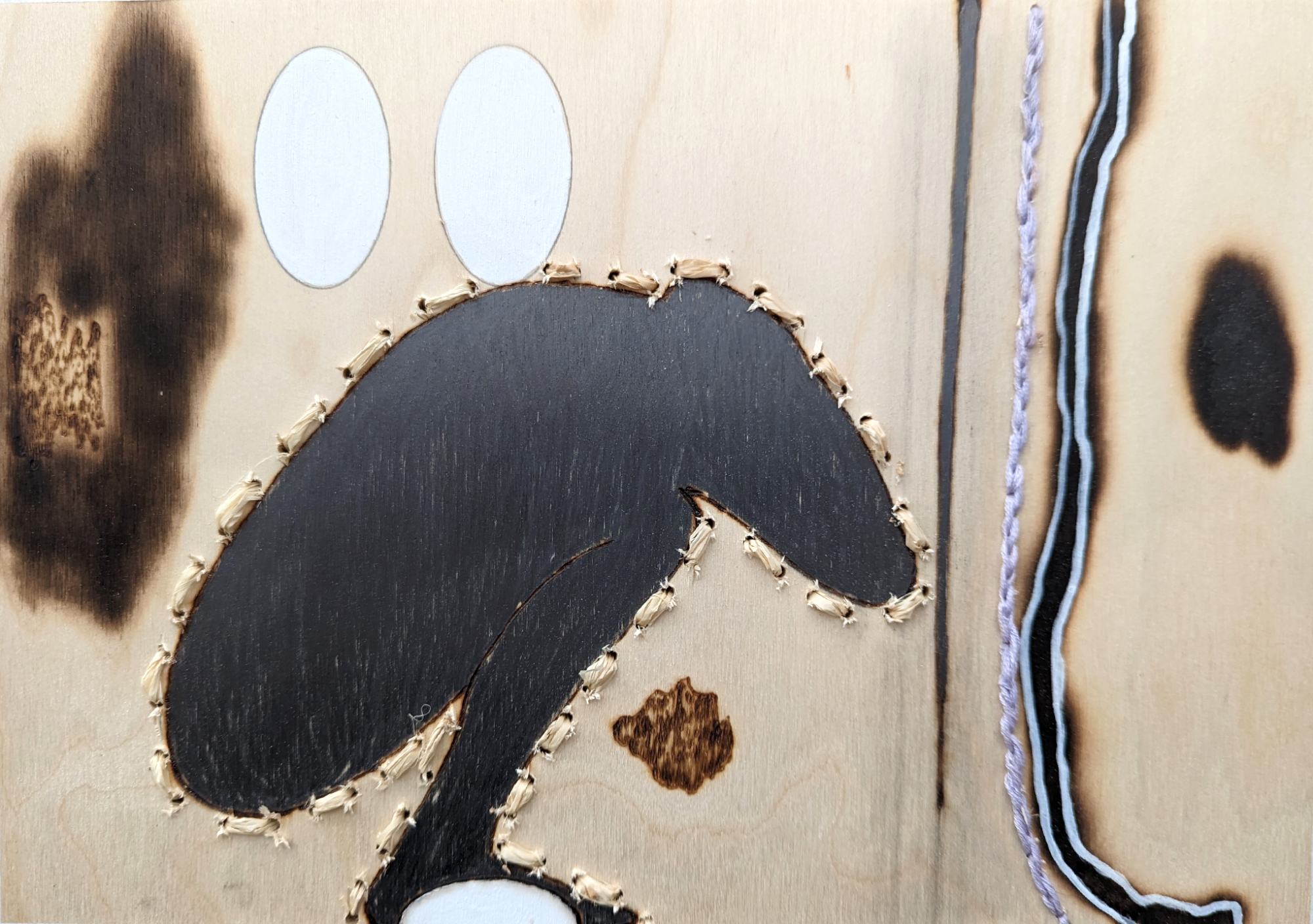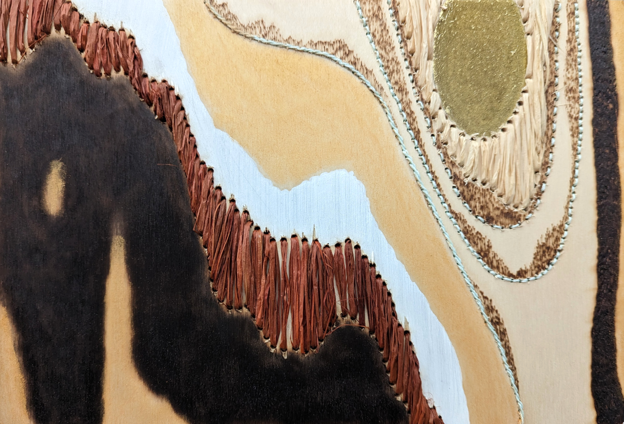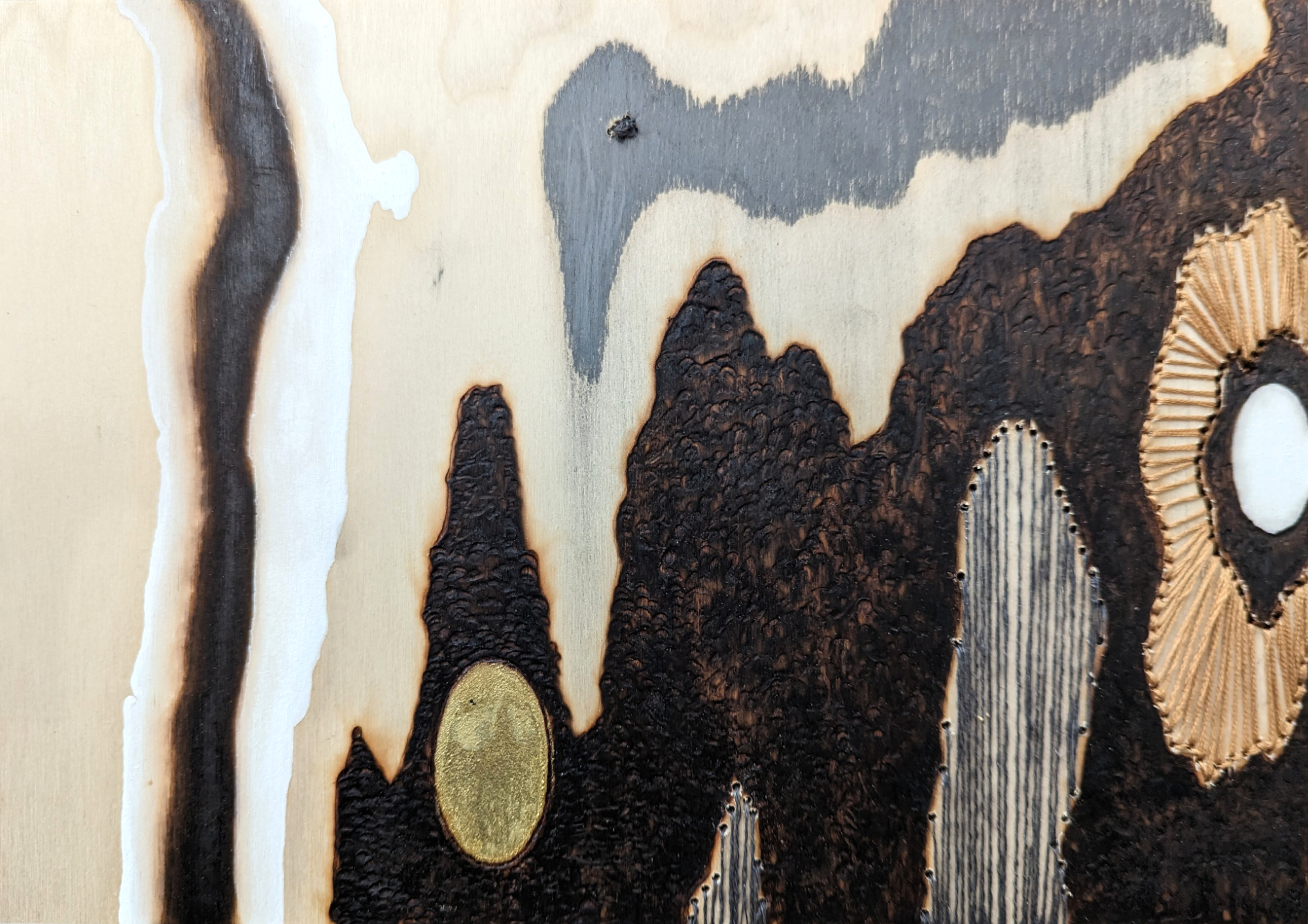 Pyrography, embroidery, graphite, chalk