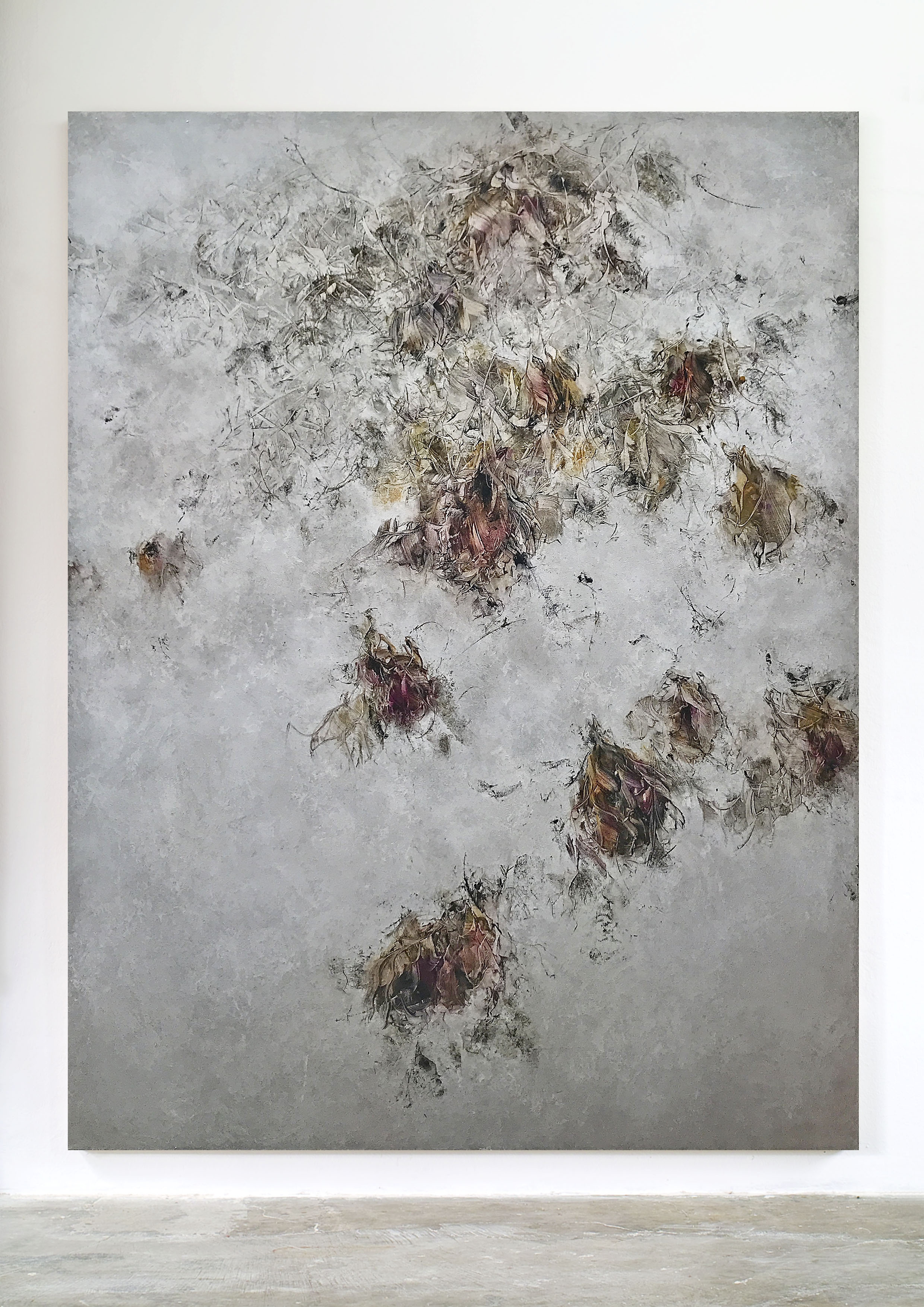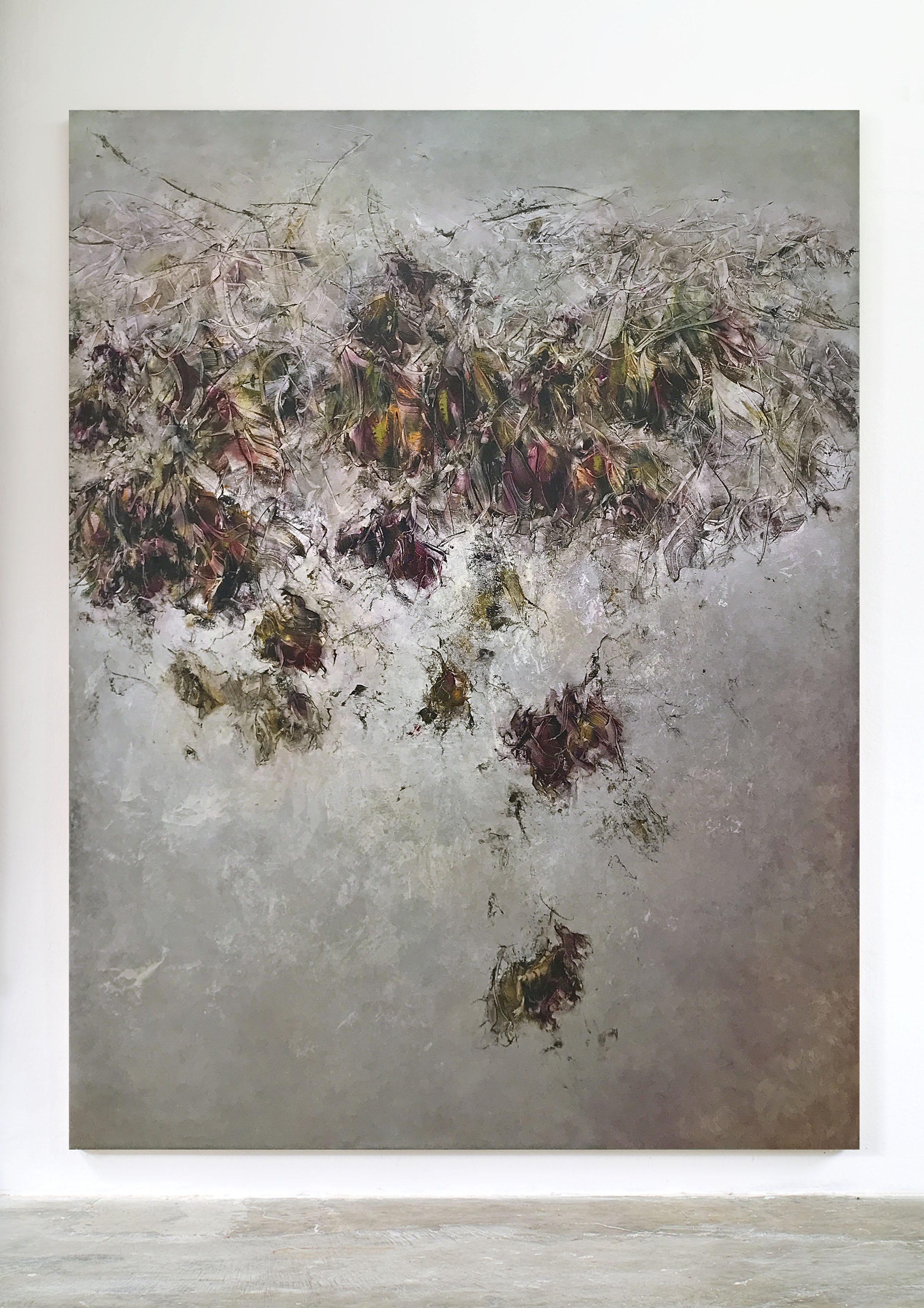 The 'scriptures'/'broken flowers'/'blossoms fall' constitute a group of works which is basing on the gestural dynamic of the painting process by dispensing with a controlled figuration. The gestures of these pictures are strictly “informel”. They arises from the tension of the conception and the unforeseeable. Out of the gestural movements, by destroying and removing the thin layers of the colour, out of the painterly working process of provoking coincidences, configurations of an imaginary flora whose forms can be perceived as analogous to real plants are created.