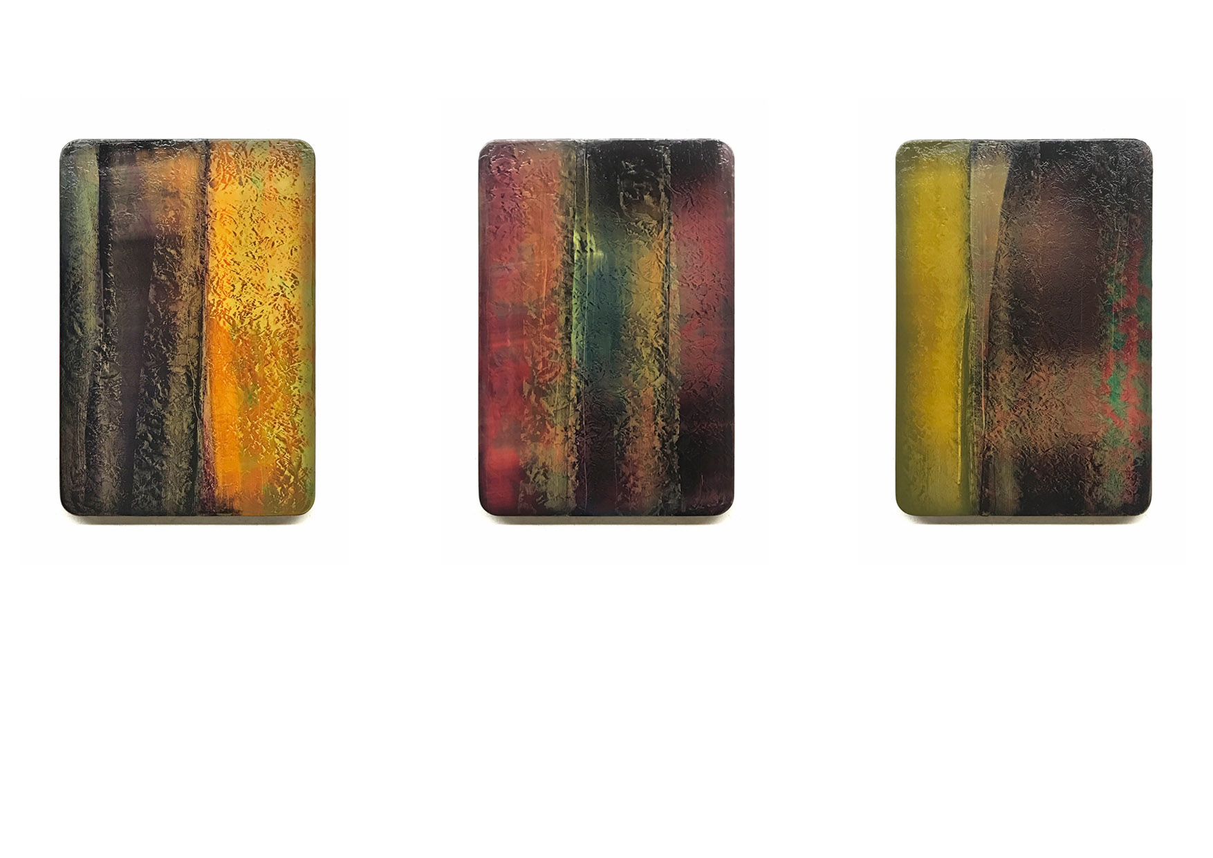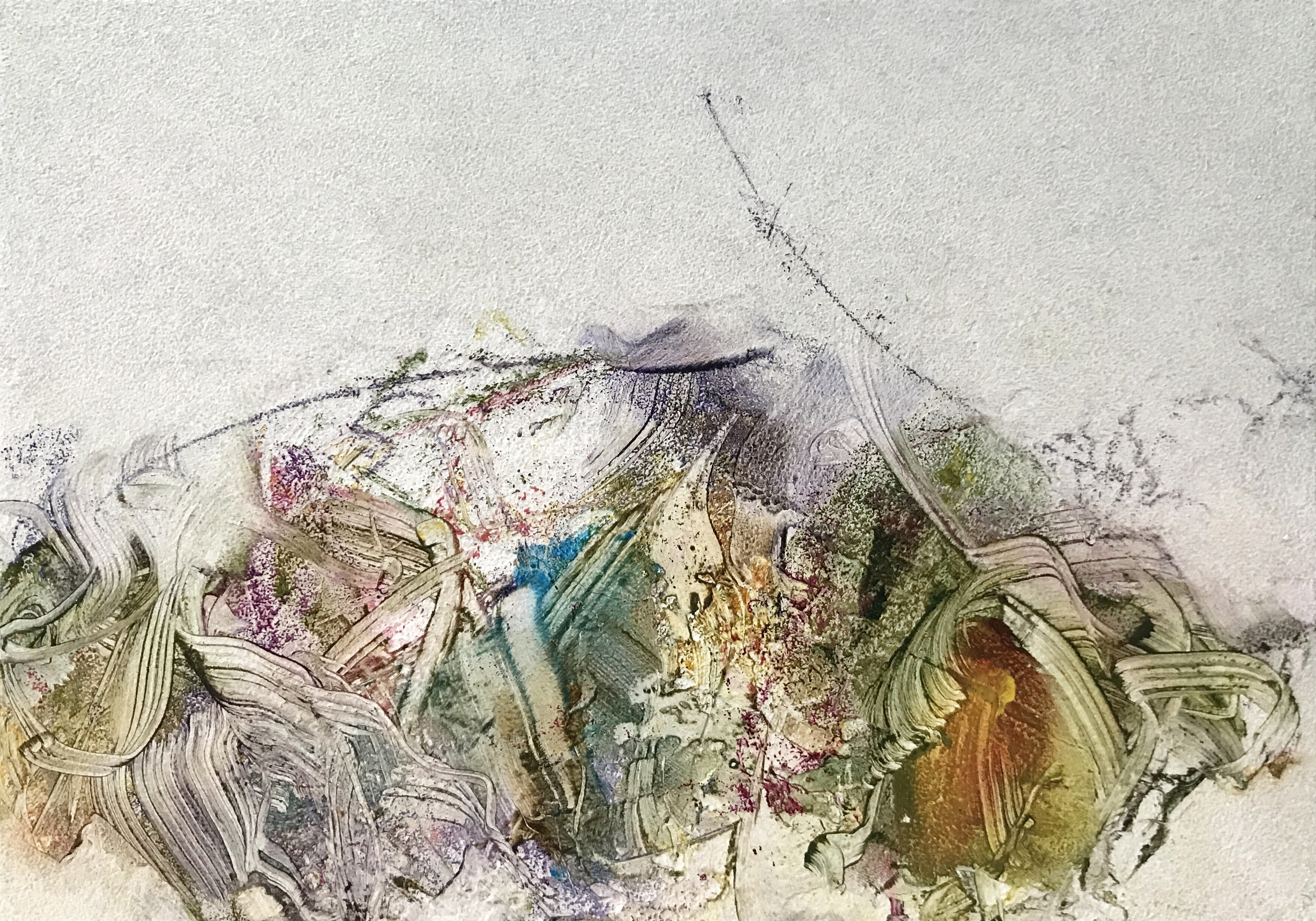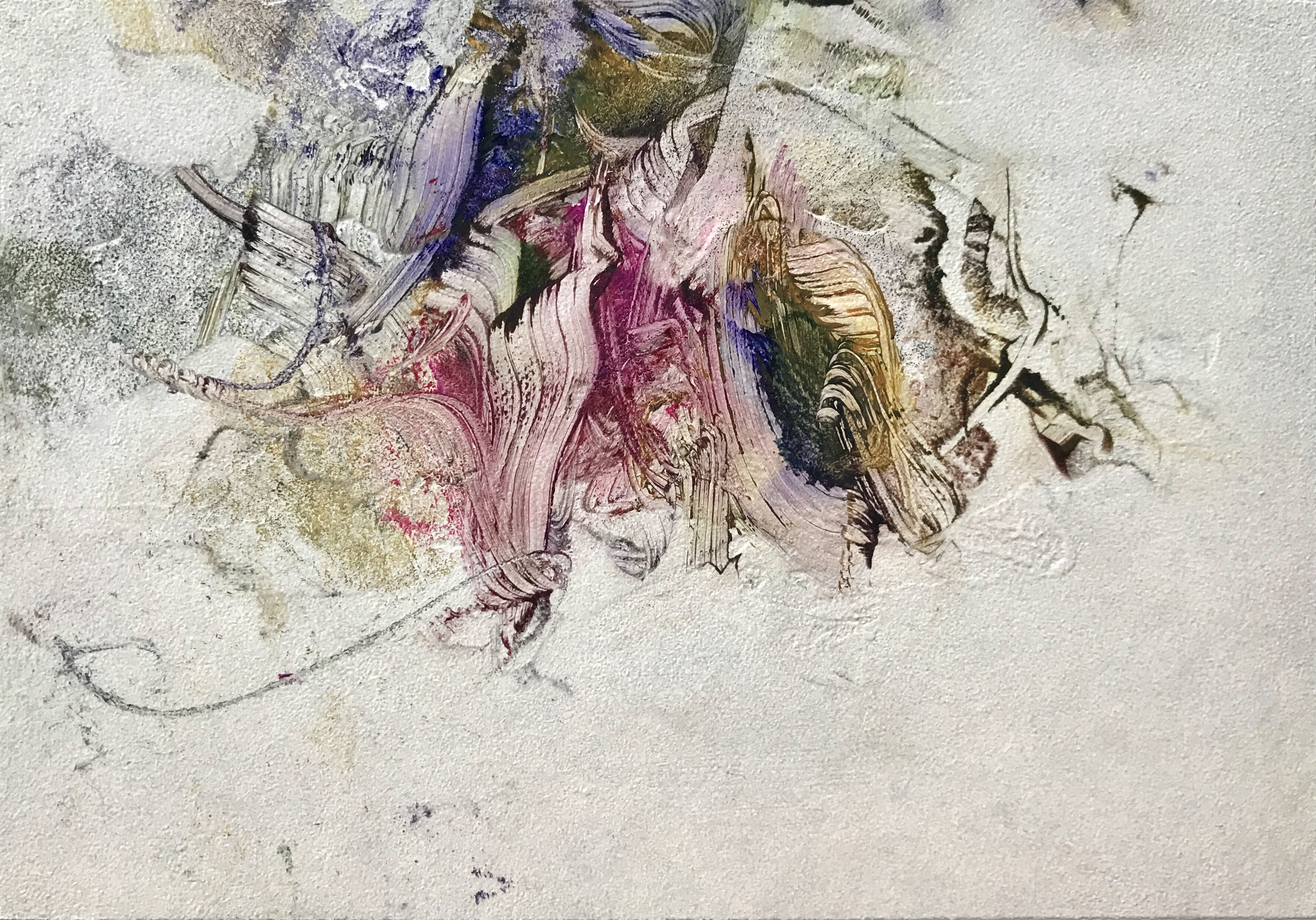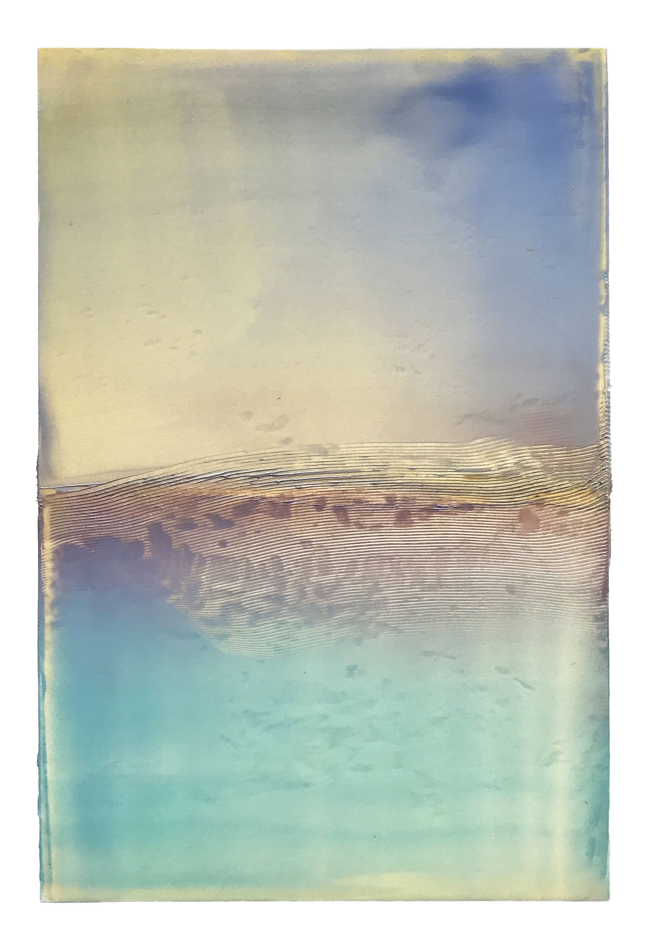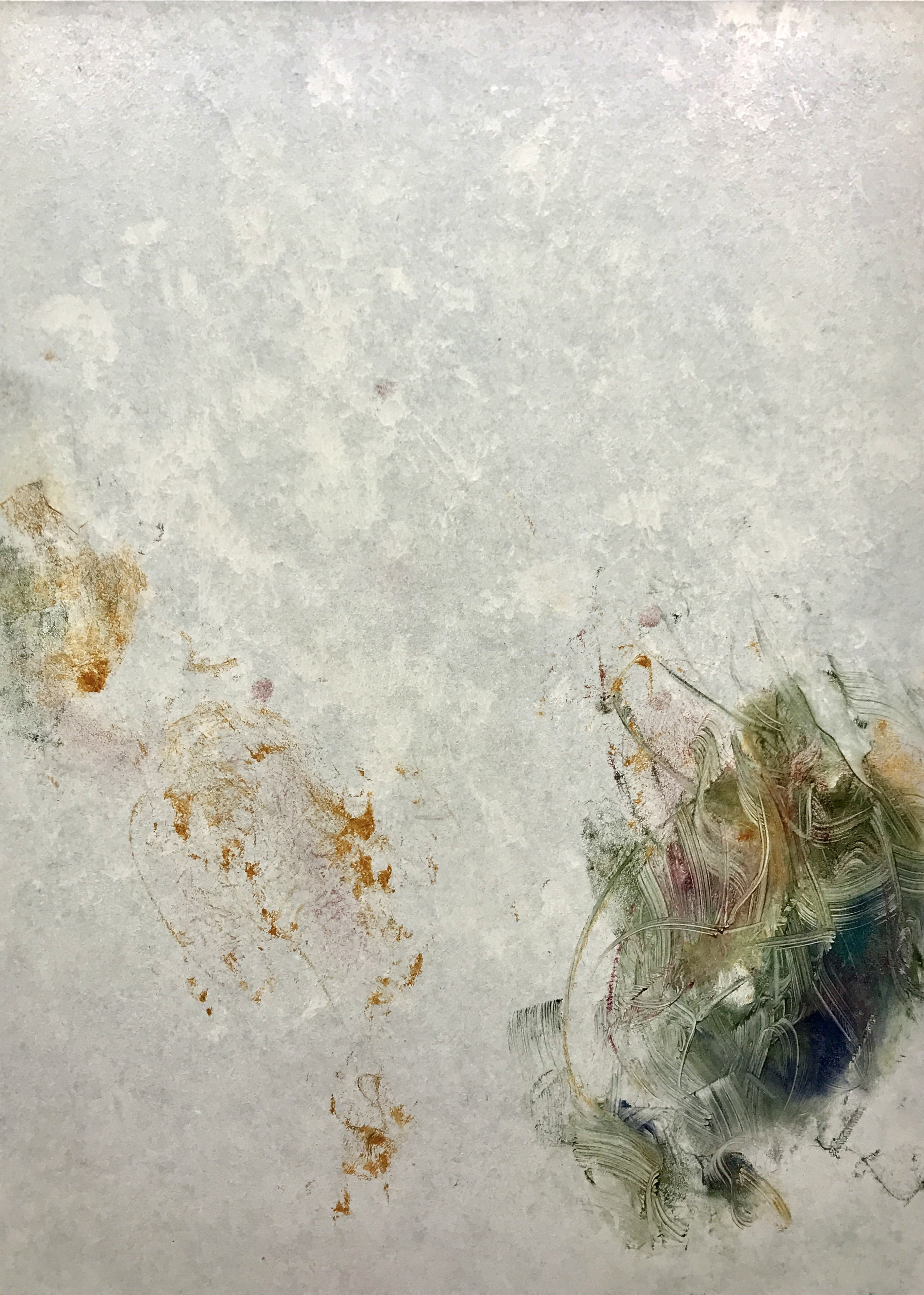 The central theme of the 'engrams' is the transition from abstract form-forming processes to landscapes that appear to be concrete. Although the works are strictly informal, that is, chance plays an important role, free landscape associations emerge, just like memories. Overlays of colored glazes are removed and destroyed in order to expose lower levels and to create the overall impression of light and an imaginary topography.