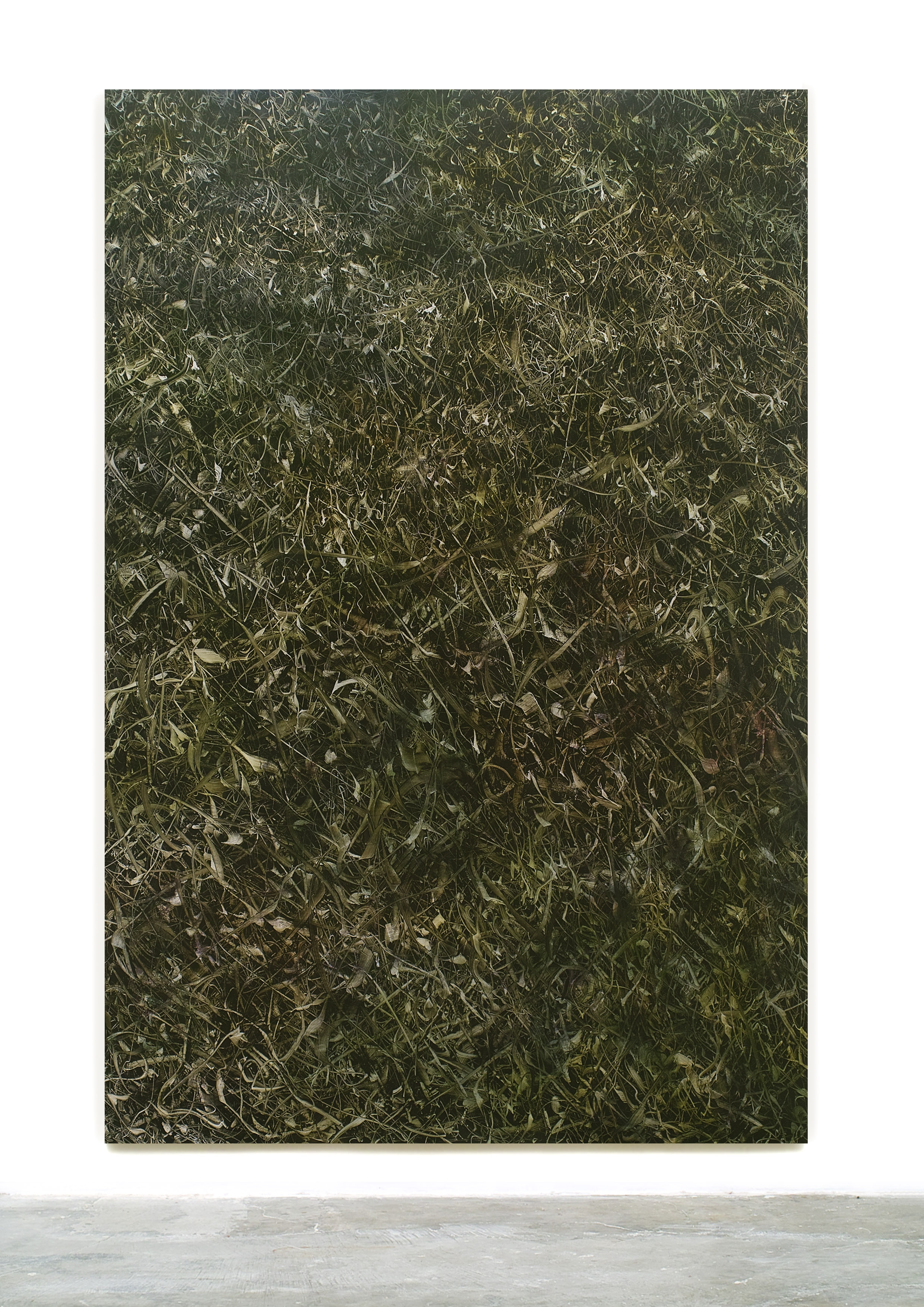 Superimposed layers of image and material, layers and transparencies evoke landscape spaces, which despite the informal gestures in the scripts / markers blend into seemingly figurative lawns or an imaginary flora that can be perceived as analogous to actual plants. Images between material self-reference and objective allusion. Whether as scoring (scripting) or extensive removal, the lesions of the surface always generate lost traces, empty spaces, which, in the exposure of the lower layers of the image, create something new and unforeseen. The motif of the landscape thus becomes a function of the material design. The strategy of provoking coincidences dispenses with a controlled figuration, with every illustrative and reproductive moment in painting. Rather, force fields emerge in the scriptures, which record the performative act of production and seek the narrowing of motif and painterly realization.
