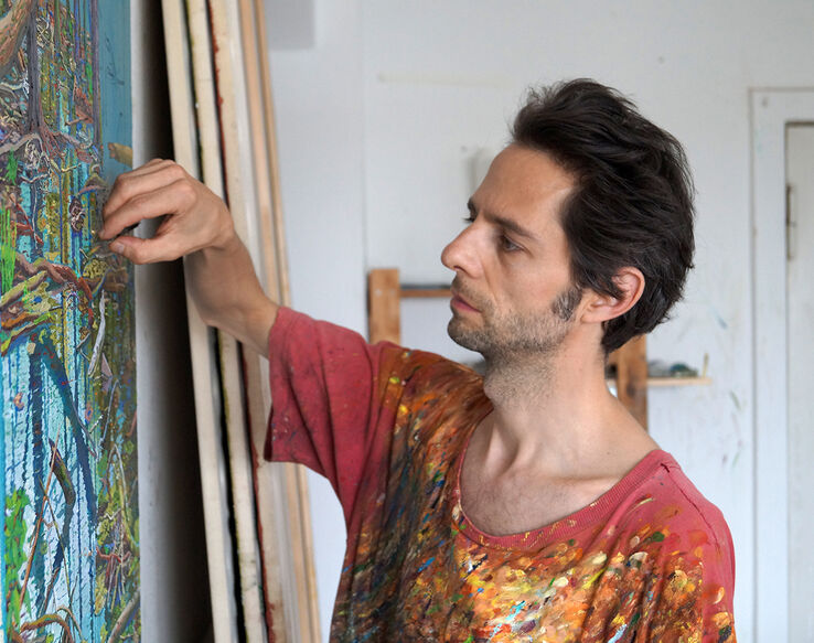 A slow work process that leads to Konstantin Déry´s paintings, and with their intricate motifs taken from nature, the viewer is invited to take them in slowly. By applying the paint with palette knives and small wooden implements, he creates rough surfaces that further increase the intensity evoked by the strong colour harmonies and structural diversity of texture that characterize his paintings. An idiosyncratic liveliness, which also inhabits the uncontrolled flora and the formations of decay, meets the viewer´s eye. It inspires a sensation in the joy of seeing, of visually experiencing, as a symbol of being alive. Viewed up close, the images in Déry´s paintings can dissolve into dynamic abstract structures, only to become all the more sensual, charged with a very inner dynamic, when seen from a certain distance.