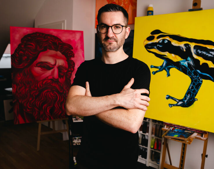 Art became a sacred space for Korbinian Hierhager, offering him not only a sense of breath but also a powerful means of expression. In his creations, he combines the meticulous precision of his technical background with a passionate dedication to the freedom of creativity. His works—a captivating blend of bold figures, vibrant animal motifs, and abstract compositions in glowing neon hues—are more than just visual masterpieces. They embody the story of a man who overcame his limits and discovered his true passion.