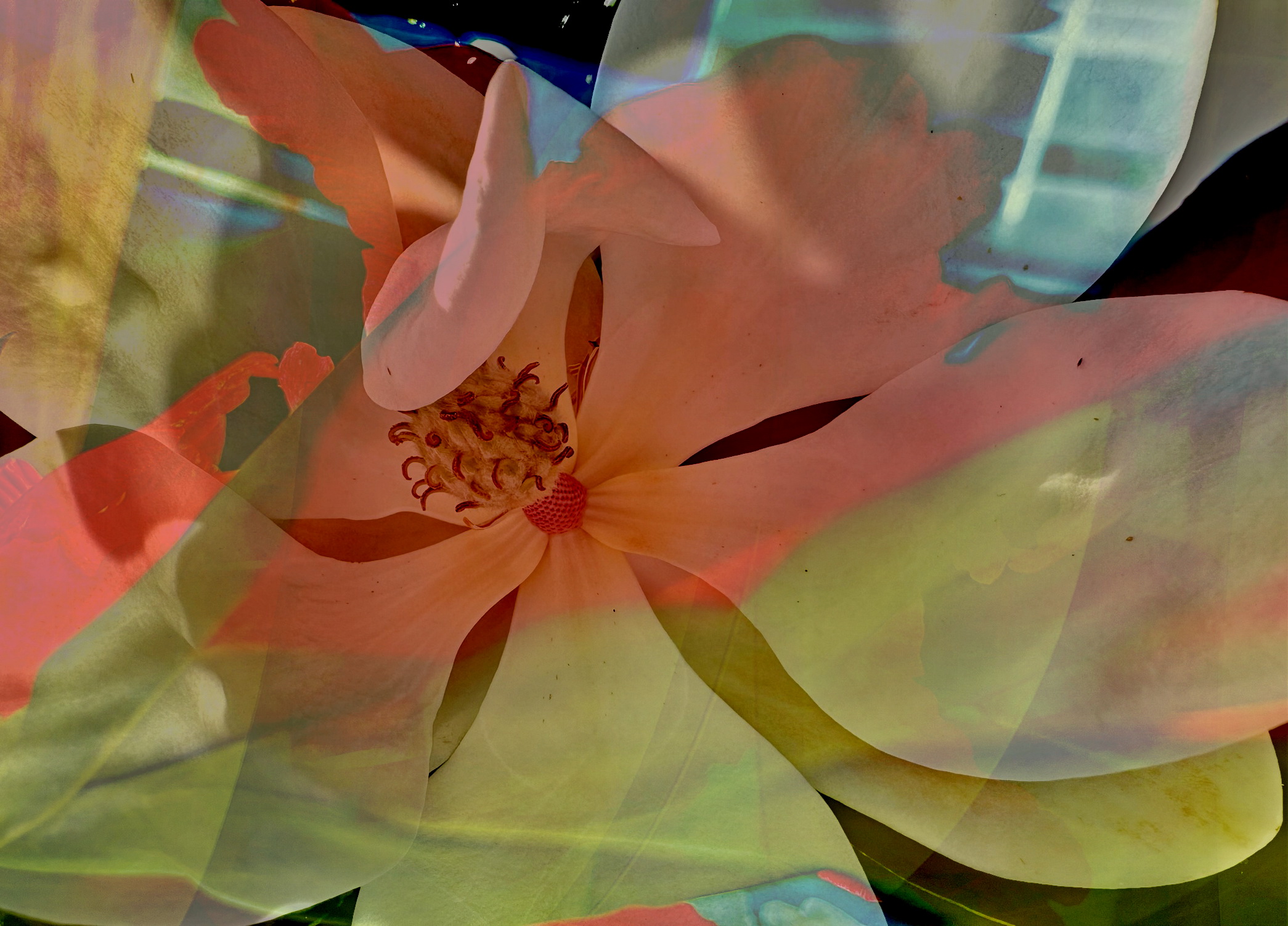 The work combines natural and technical forms without giving a rating. The visual effect is created through intense colours and light-dark contrasts.