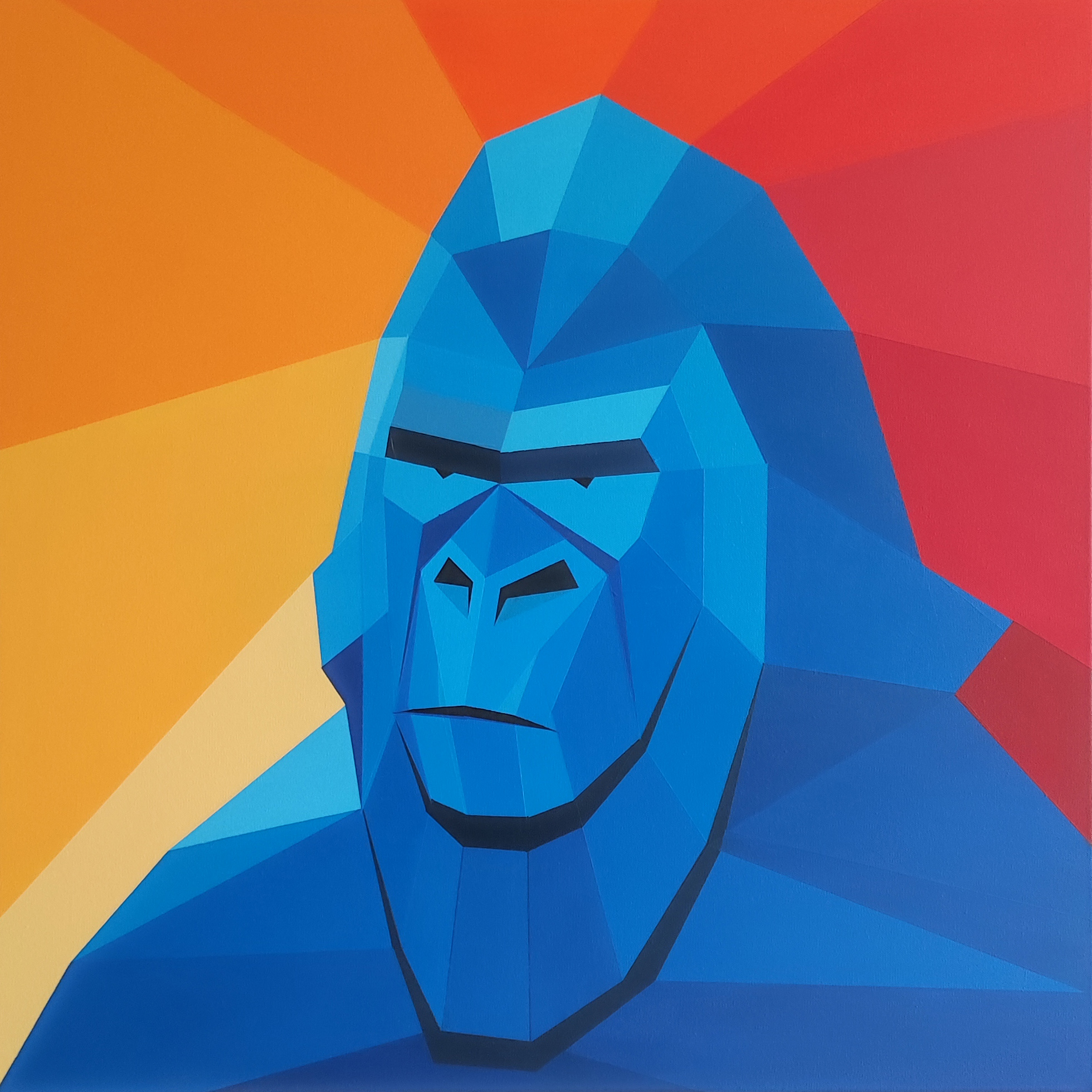 The Dictator is a striking geometric portrait of a gorilla, rendered in a bold spectrum of blues that exudes strength, authority, and calculated control. The angular forms give the figure a monumental presence, while the intense stare and firmly closed mouth hint at power held in silence. The vibrant background, bursting with shades of red, orange, and yellow, radiates like a political sunburst—evoking propaganda posters and revolutionary iconography. This juxtaposition of cool dominance against a fiery backdrop intensifies the symbolism, suggesting a figure who commands not just through force, but through presence and unspoken influence. A modern totem of power, The Dictator challenges viewers to reflect on the nature of leadership, control, and perception.