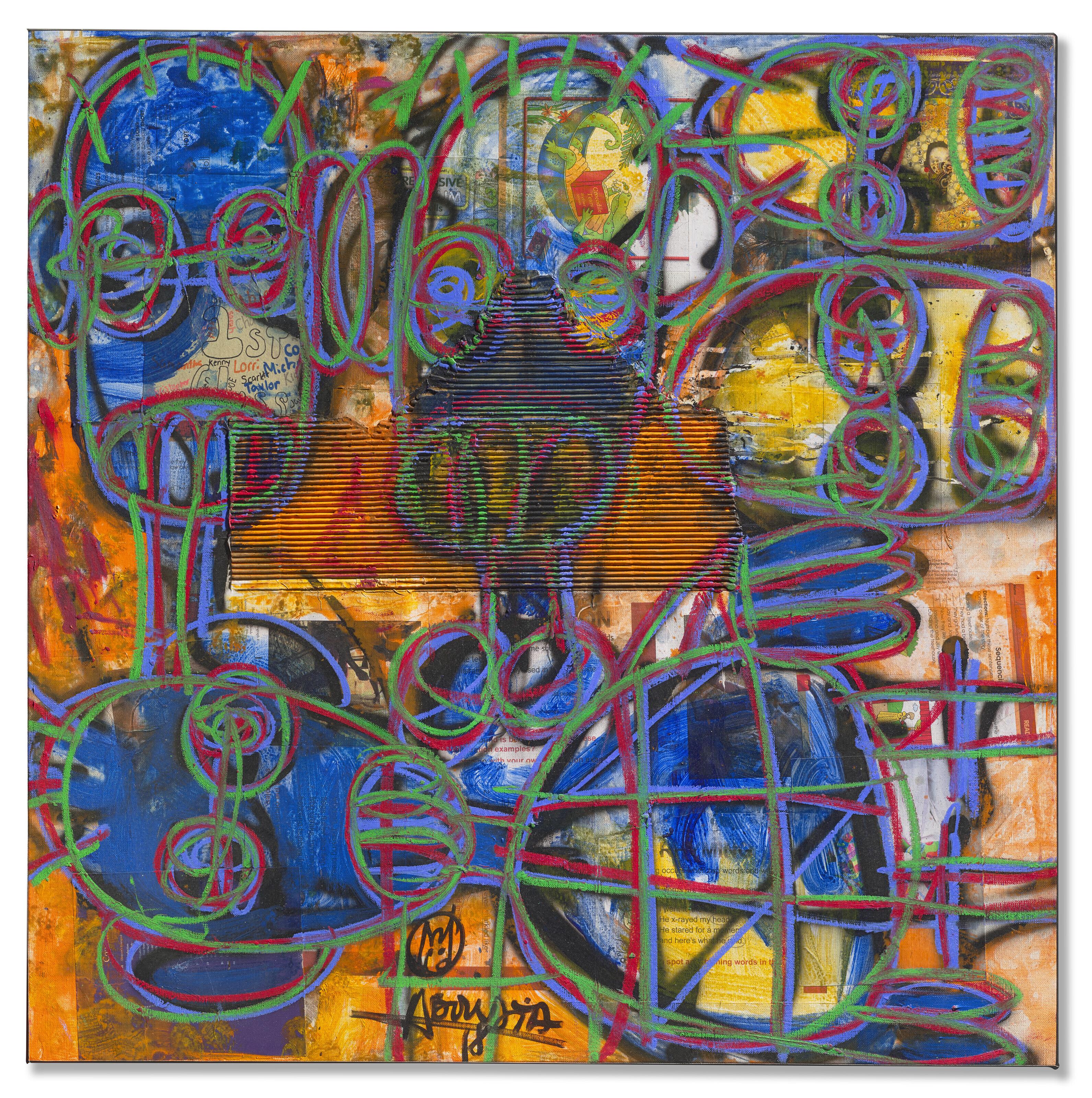 ABOUDIA (B. 1983) Réunion de Famille signed and signed with the artist's monogram ‘ABOUDIA’ (lower centre) acrylic, oil stick, found paper collage and corrugated cardboard on canvas 47 1 ⁄ 4 x 47 1 ⁄ 4 in. (120 x 120cm.) Executed circa 2018