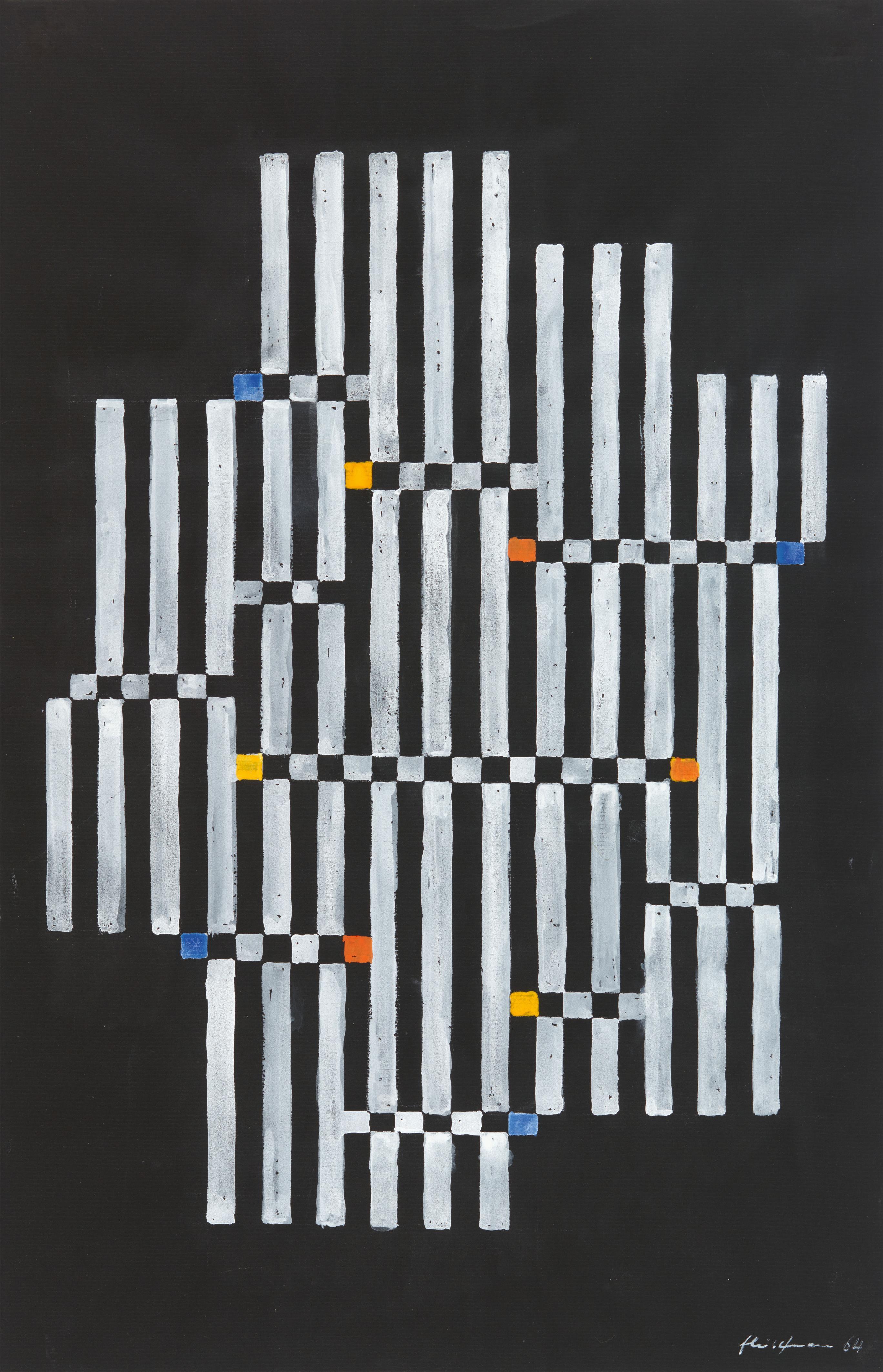 Gouache über Kreidezeichnung auf schwarzem Tonpapier. 50 x 32,5 cm. Unter Glas gerahmt. Unten rechts weiß signiert und datiert 'fleischmann 64'. - In schöner Erhaltung. Mit kleinem, professionell geschlossenem Riss links.