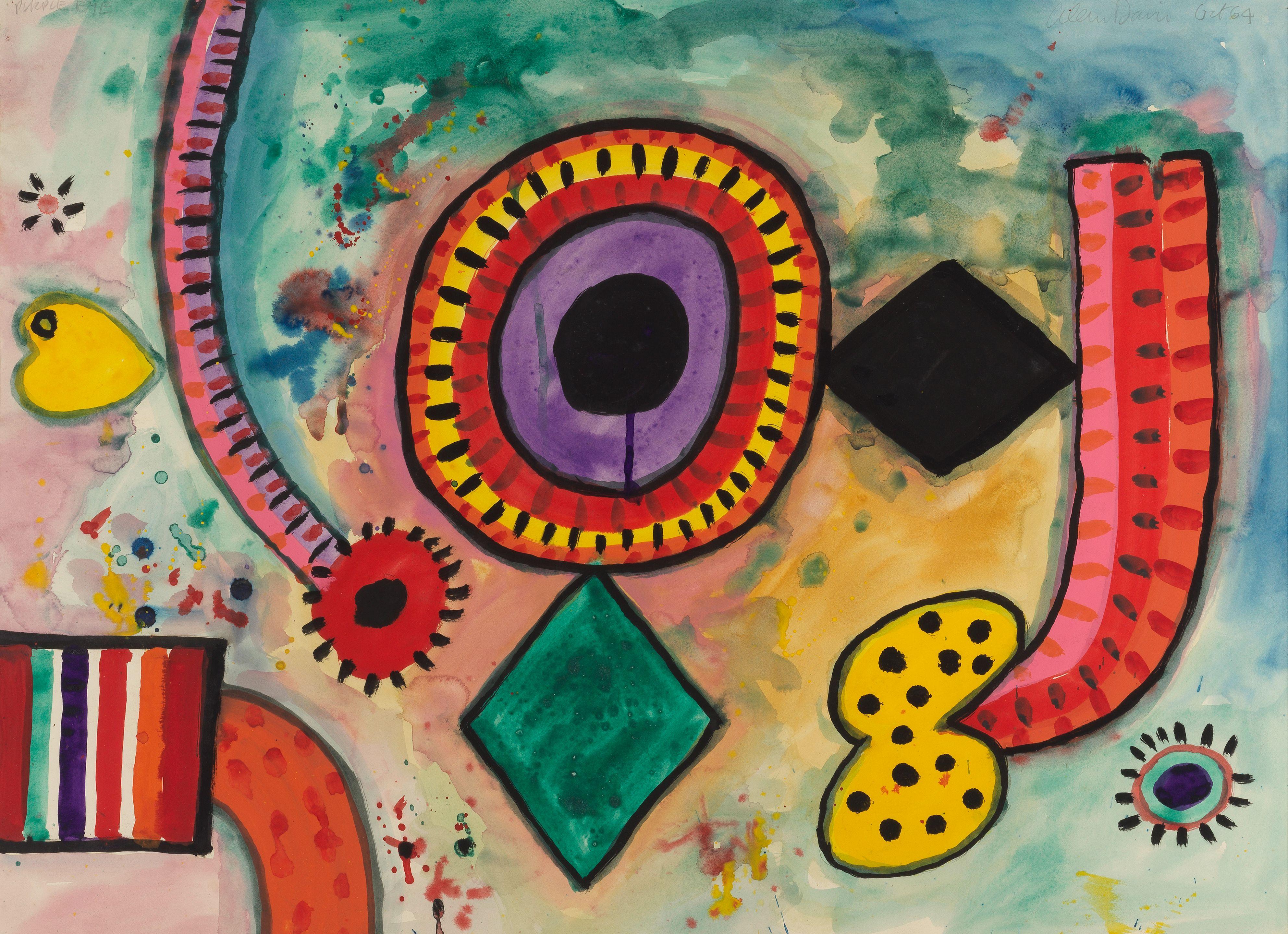 signed and dated 'Alan Davie Oct 64' (upper right), titled 'PURPLE EYE' (upper left)