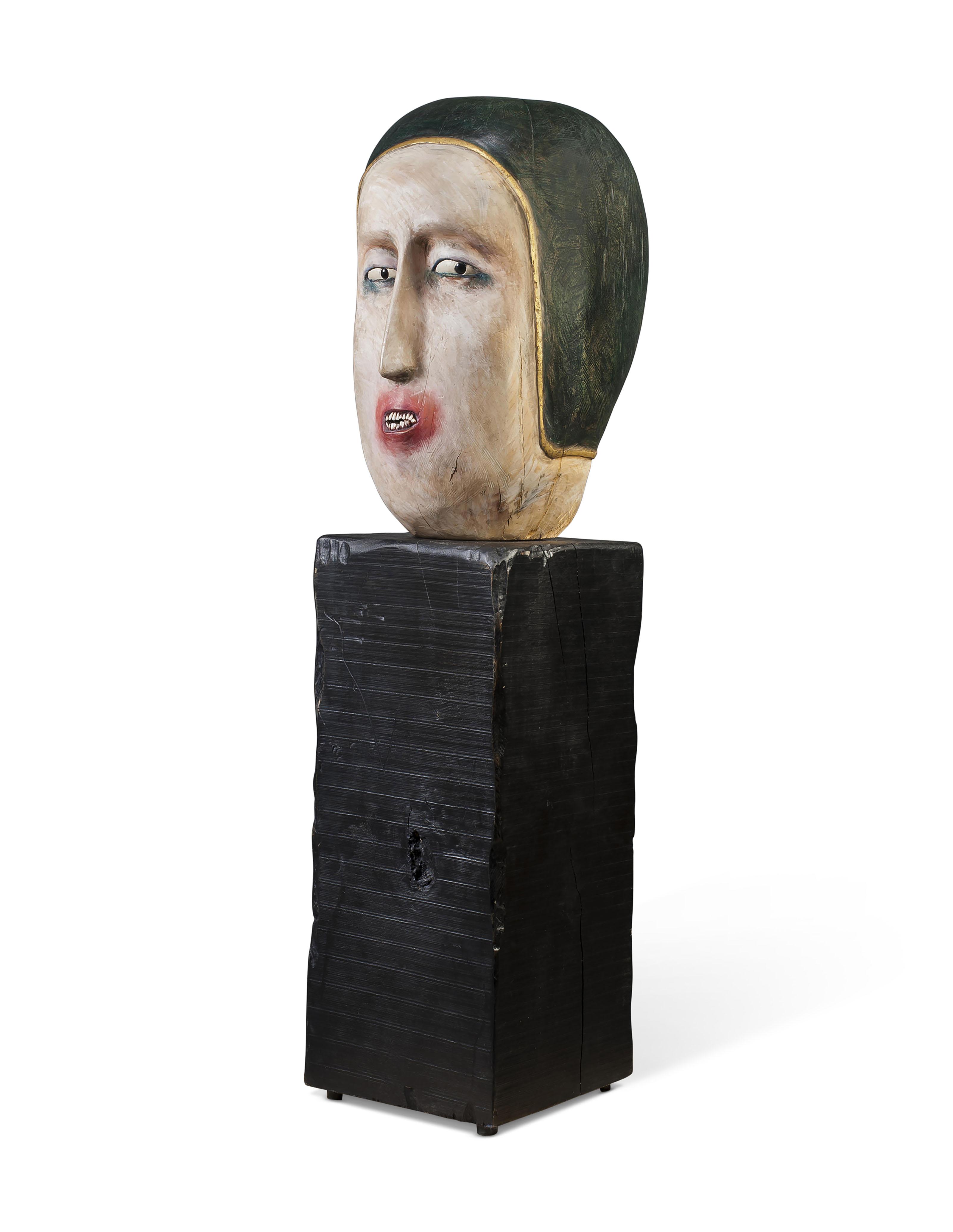 polychrome wood, acrylic, onyx and gold leaf on a painted wooden base, unique