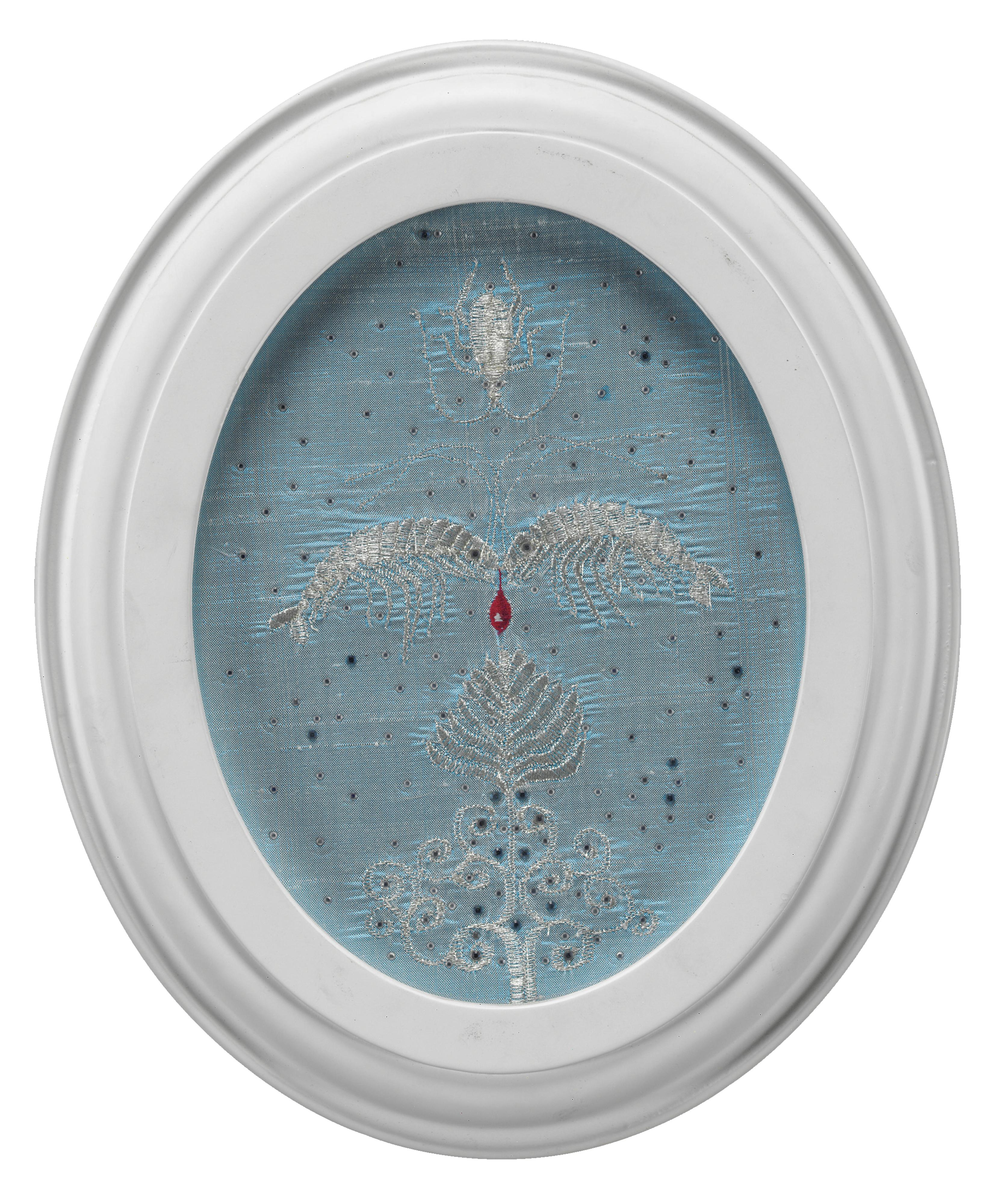 SENZA TITOLOSIGNED AND DATED 2003 ON THE REVERSE, EMBROIDERY ON SILK STRETCHED OVER LINEN, WITH CRYSTALS AND STEINLESS STEEL