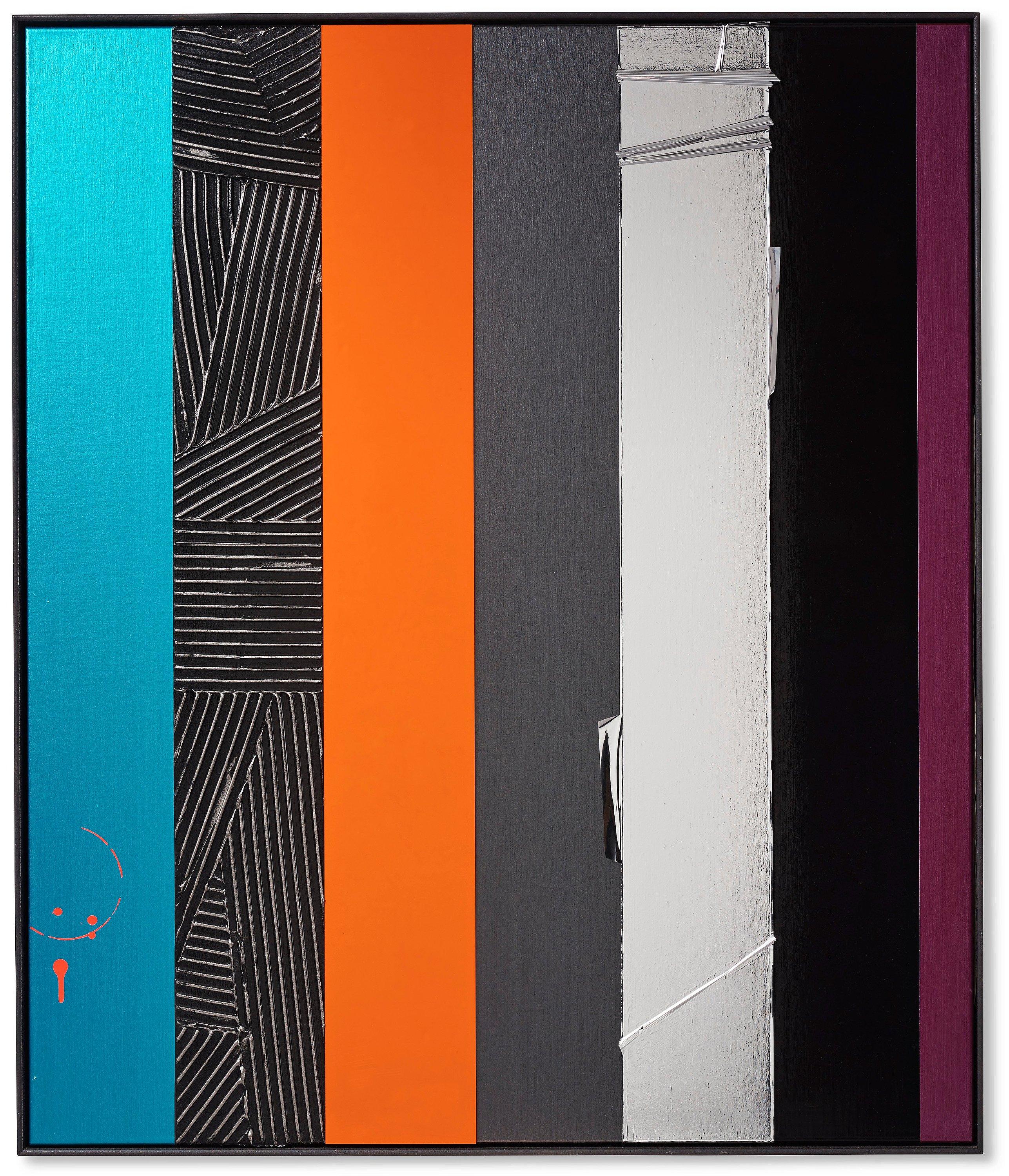 Signed Anselm Reyle and dated 2007. Acrylic, silver foil, plexi glass on canvas 137.7 x 116.5 cm including the steel frame.