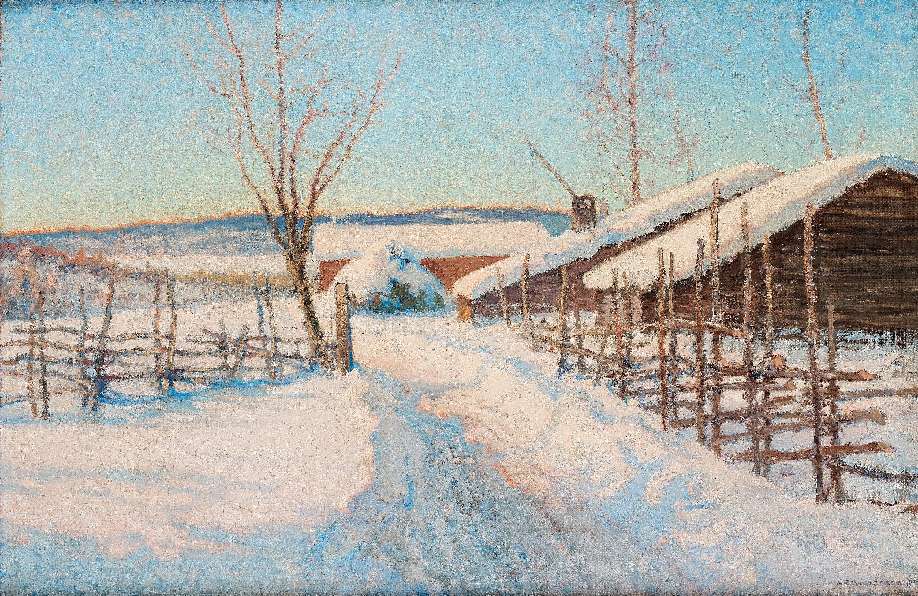 When the work "Vinterdag (motiv från södra Dalarne - Bergslagen)" Winter landscape from Dalarna in Sweden by Anshelm Schultzberg was auctioned at Bukowski in Stockholm in December 2020, the result was somewhat disappointing. The auction house had previously given the estimated price as a range of SEK 25,000.00 – 30,000.00, of which not even the lower limit was reached - in fact, the artwork changed hands for SEK 22,000.00 (€ 2,191.01). Of course, this price has nothing to do with the top prices that other works by Anshelm Schultzberg achieve. The highest price we have observed so far was reached by the work Spring landscape from Graversfors in December 2014 with an auction result of SEK 270,000.00 (€ 28,515.00).