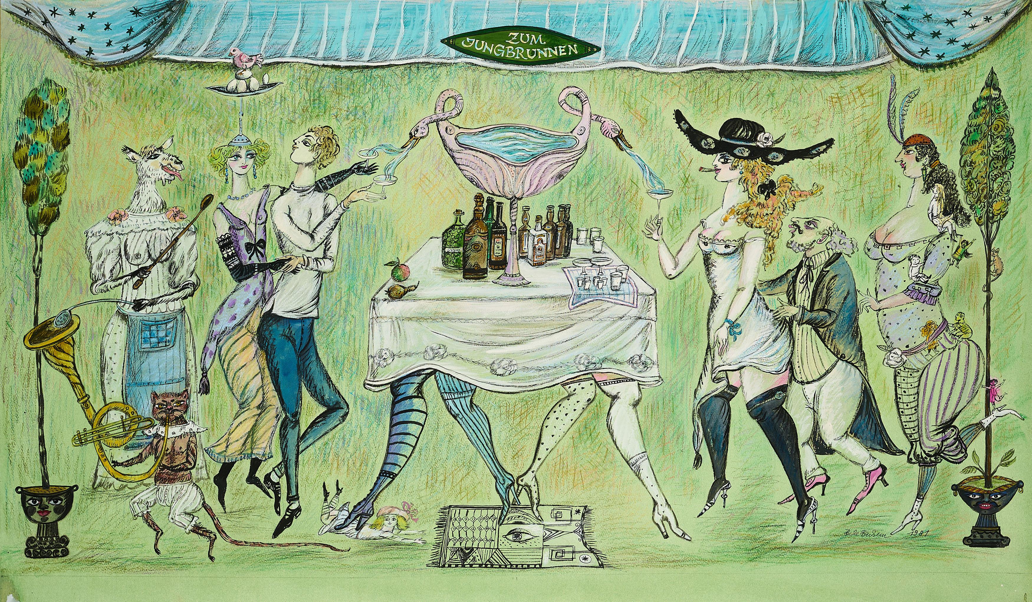 Bezeichnung: Betitelt oben: ZUM JUNGBRUNNEN. Sowie signiert und datiert unten rechts: Bele Bachem 1981.