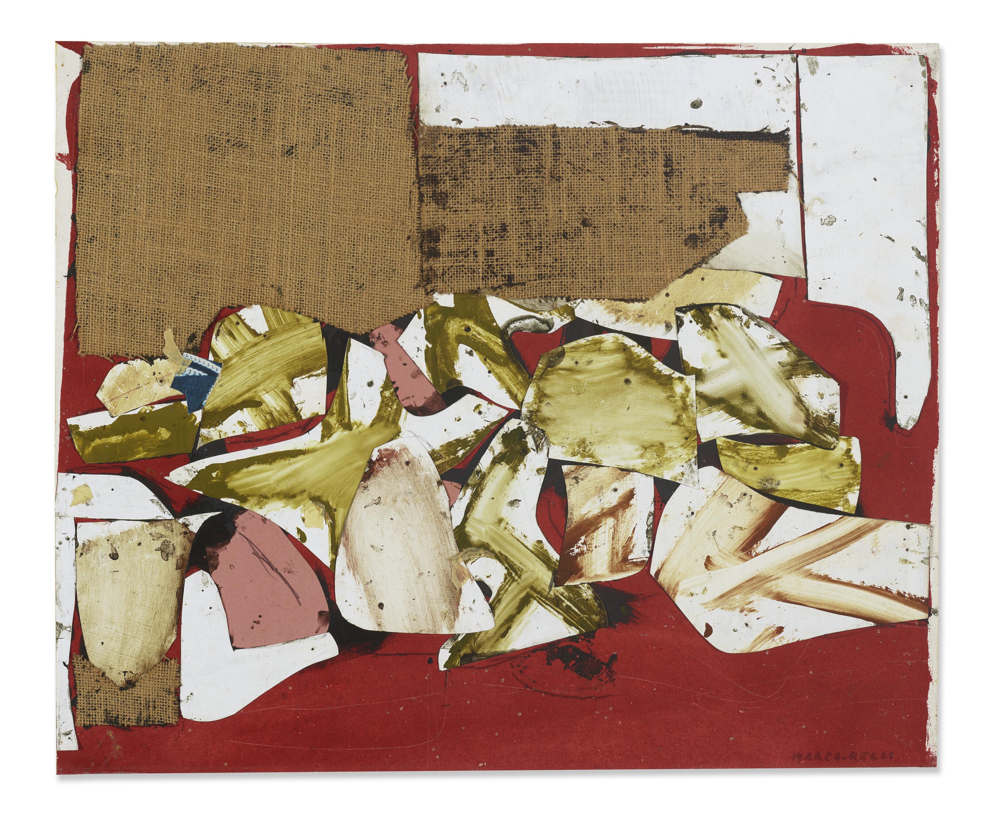 CONRAD MARCA-RELLI (1913-2000) S-X-5-78 signed 'MARCA-RELLI' (lower right); signed again and titled 'MARCA-RELLI S-X-5-78' (on the reverse) oil, burlap and canvas collage on canvas mounted to board 17 1 ⁄ 2 x 21 1 ⁄ 4 in. (42 x 50.8 cm) Executed in 1978. This work is registered with the Archivio Marca-Relli under the number MR-6267.