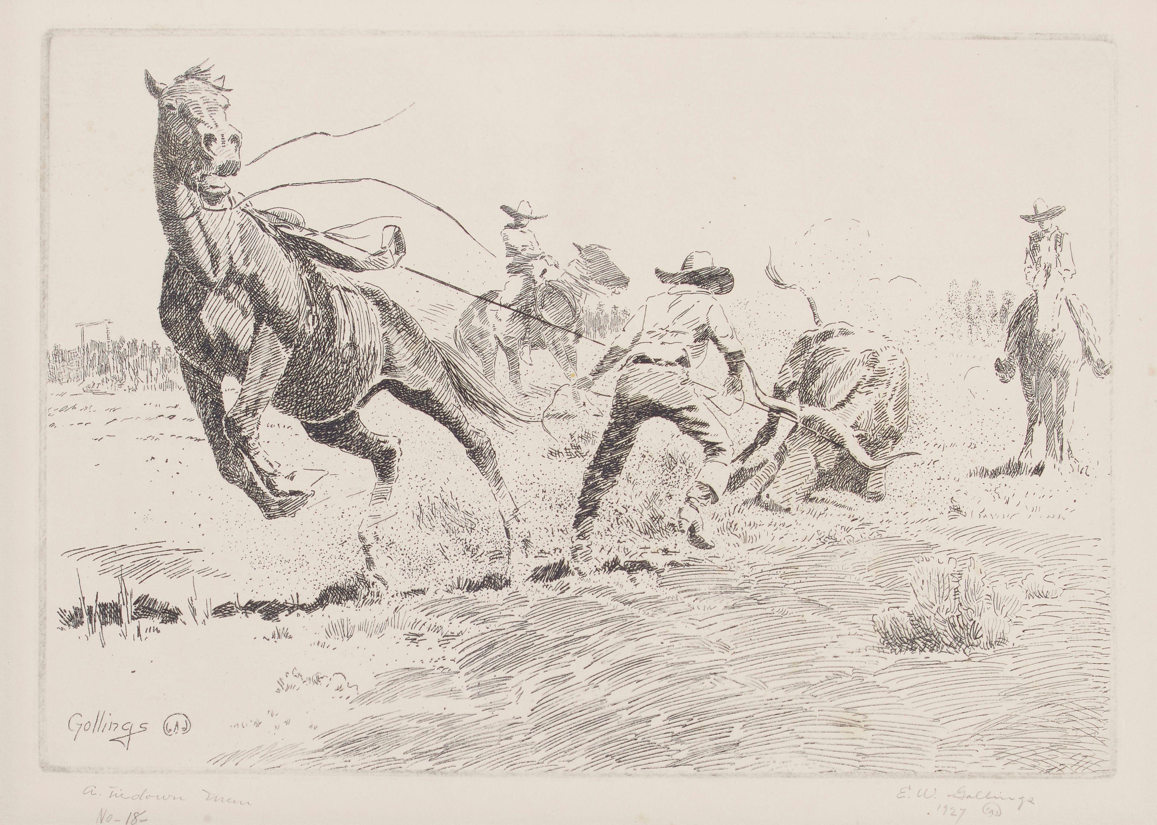 Dieses Kunstwerk von William Elling Gollings erzielte im November diesen Jahres bei Bonhams in Los Angeles einen unerwartet hohen Preis. In der Auktion Western Art wurde die Arbeit A Tie Down Man, 1927 für USD 4.480,00 (€ 4.107,08) versteigert – und damit weit über dem oberen Schätzpreis von USD 2.500,00. Dieser Preis hat freilich nichts mit den Spitzenpreisen zu tun, die andere Arbeiten von William Elling Gollings erzielen. Den höchsten von uns bisher beobachteten Preis erreichte die Arbeit Buying Buckskins im Februar 2019 mit einem Auktionsergebnis von USD 220.000,00 (€ 193.338,61).