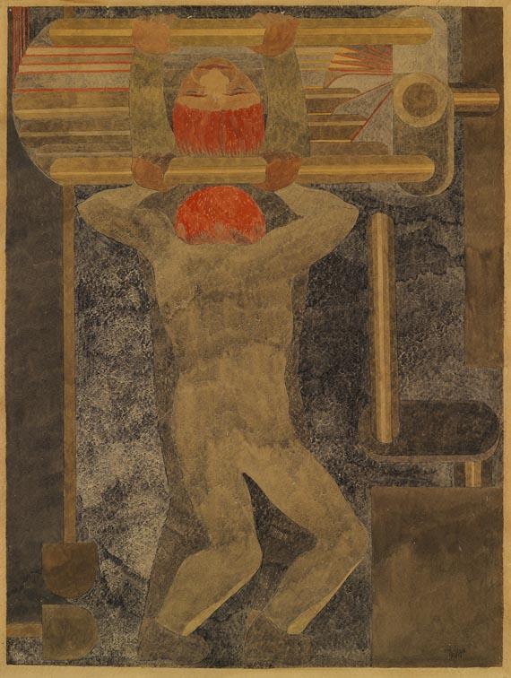 Anfang der 30er Jahre führte die Künstlerin eine Serie von Arbeiterbildern an technischem Gerät aus. Vermutlich entstand diese Reihe von Arbeiten im Zusammenhang mit einer Projektidee für die Weltausstellung in Chicago. Auf unserem Blatt werden 2 Bewegungssequenzen eines Arbeiters an einer Kurbel dargestellt. [KD].
