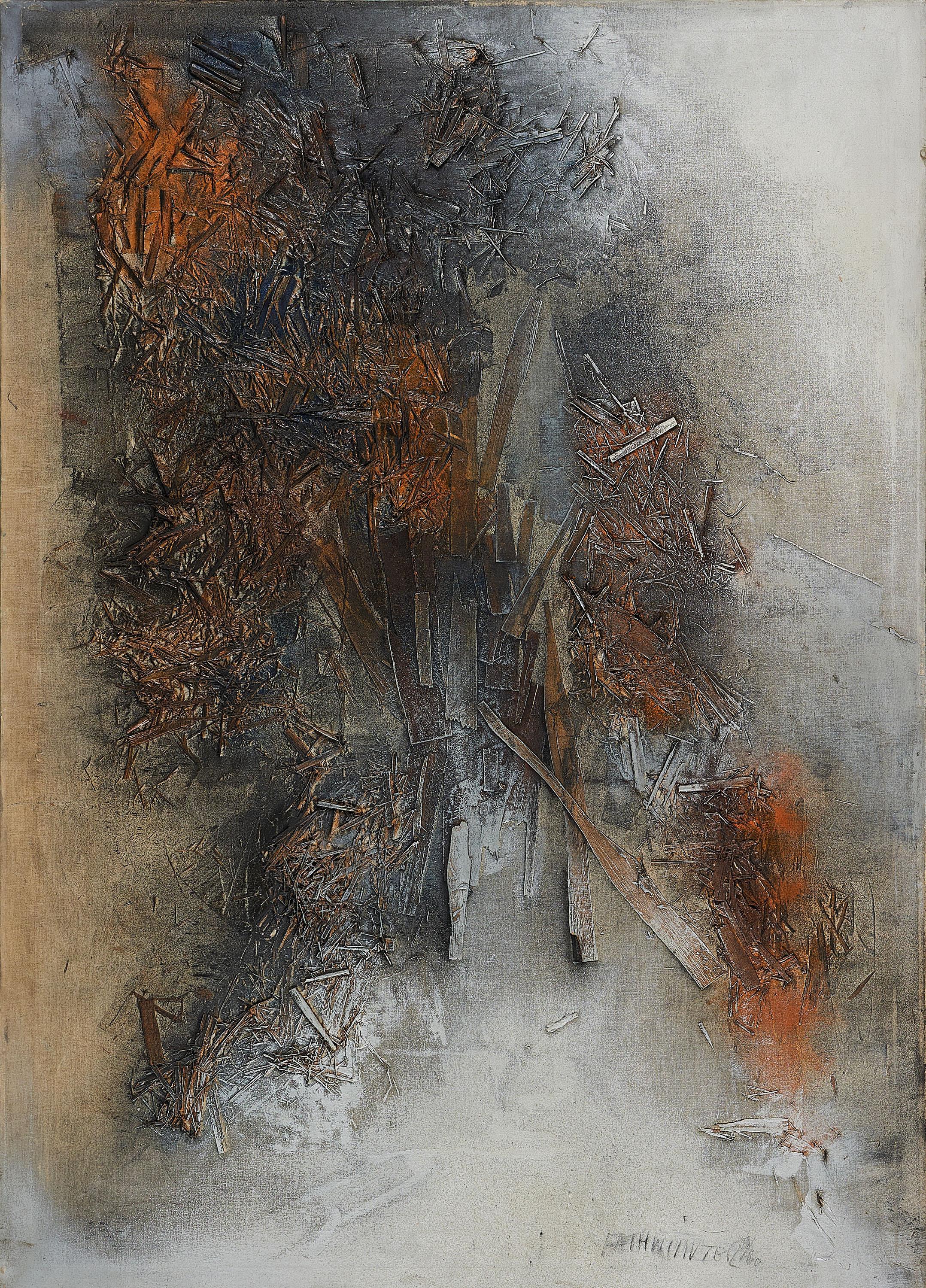 Bezeichnung: Signiert und datiert unten rechts: FATHWINTER / 60. Sowie signiert, datiert und betitelt verso: FATHWINTER Düsseldorf, Allemagne Germany Strukturelles Ereignis "Haowe" Mischtechnik 1959/60 (für Surrealisten: "Unzugängliche Einsiedelei".