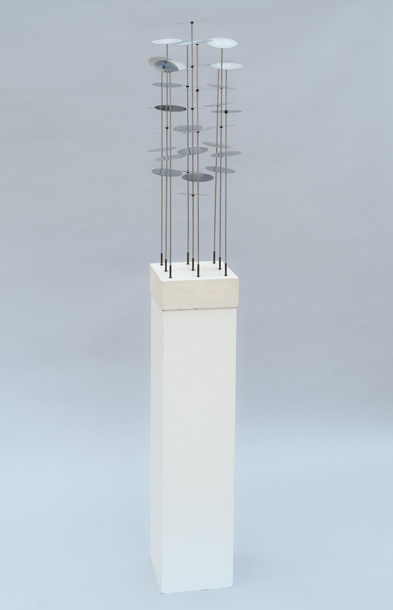 Edelstahlscheiben und -stäbe, weiß gefasster Holzsockel und Elektromotor. (1969). Gesamt ca. 96 x 30 x 28 cm (Sockel ca. 25 x 25 x 10 cm).
