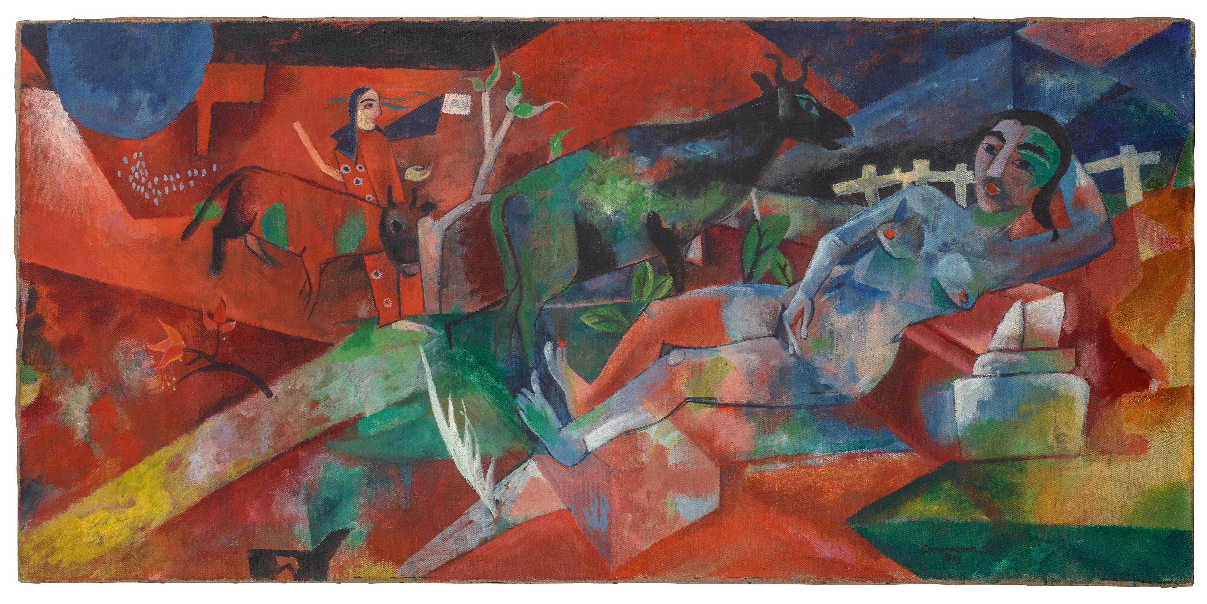 Öl auf Leinwand mit Fischgrätstruktur. 60 x 125 cm. Unter Glas gerahmt. Unten rechts schwarz signiert und datiert 'Campendonk 1918'. - In tadellosem Zustand.