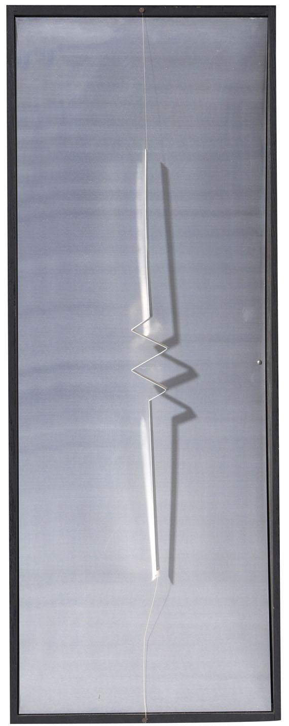 Multiple. Bewegliches Aluminiumelement vor Aluminiumplatte in schwarz gefasstem Holzobjektkasten.