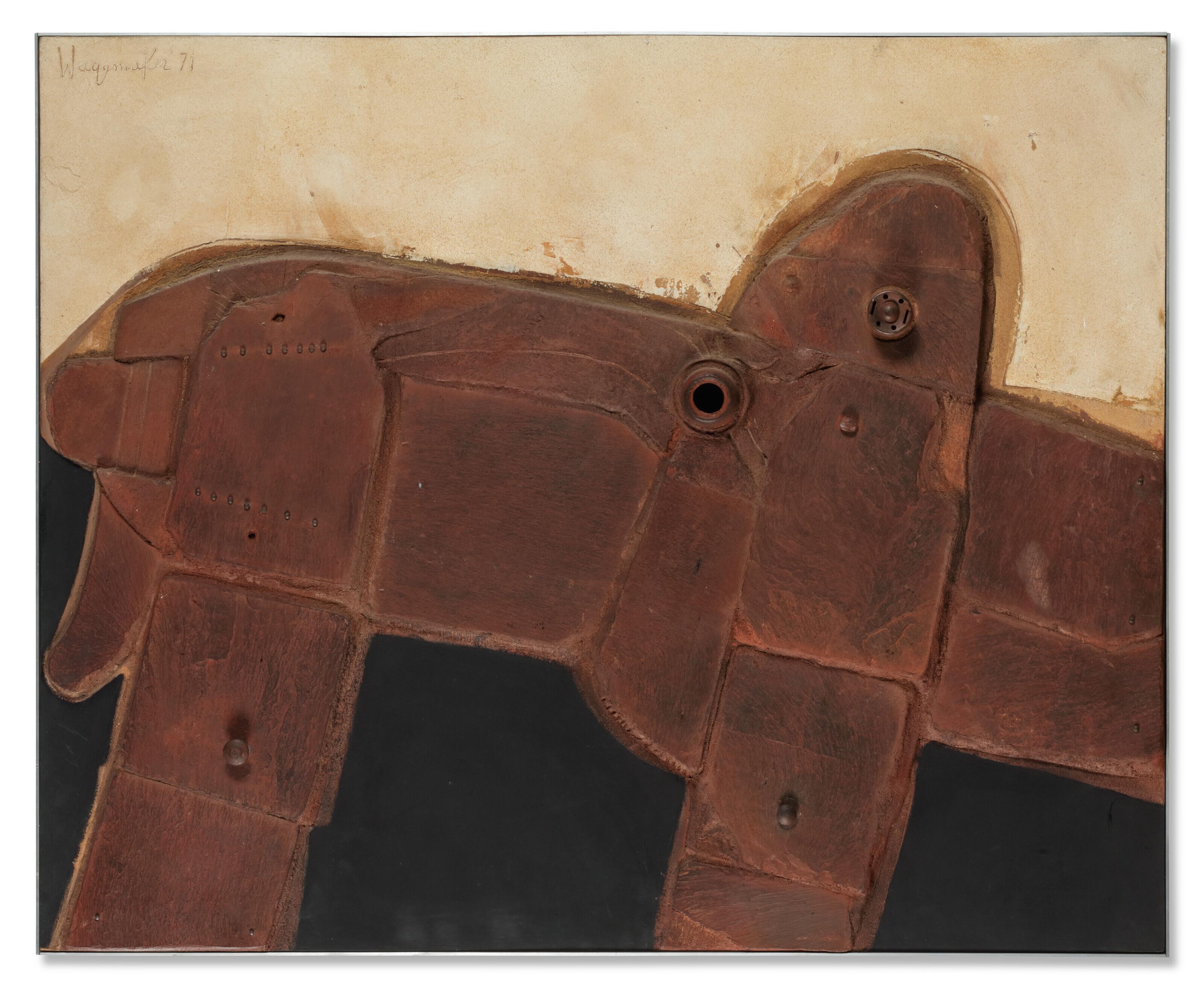 JAAP WAGEMAKER (1906-1972)<br><i>Rode Leisteen</i><br>incised with the artist's signature and date 'Wagemaker '71' (upper left); signed, numbered and dated 'jaap wagemaker '71 480' (on the reverse)<br>mixed media relief on panel, in artist's frame<br>82 x 101cm.<br>Executed in 1971<br>